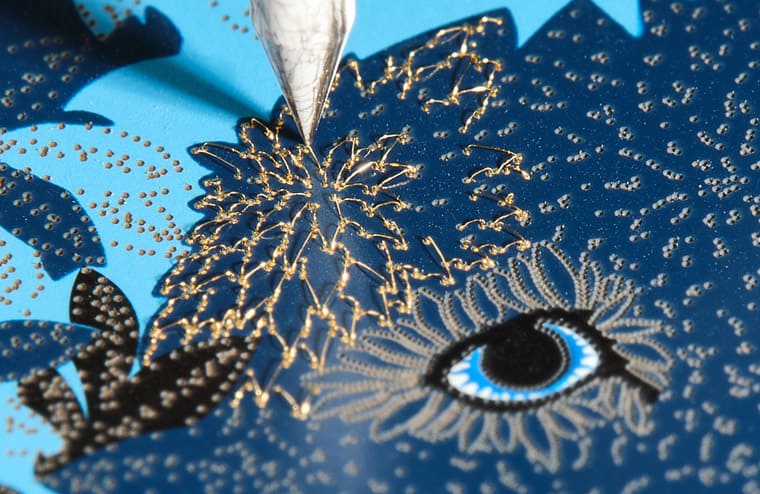 ▲爱马仕用25微米纯金线来连结图案的两处而形成装饰的金线段,面盘图案中狮子的脸庞与旁边的树叶就是用这技术装饰,看起来很像在金质面盘上刺绣。