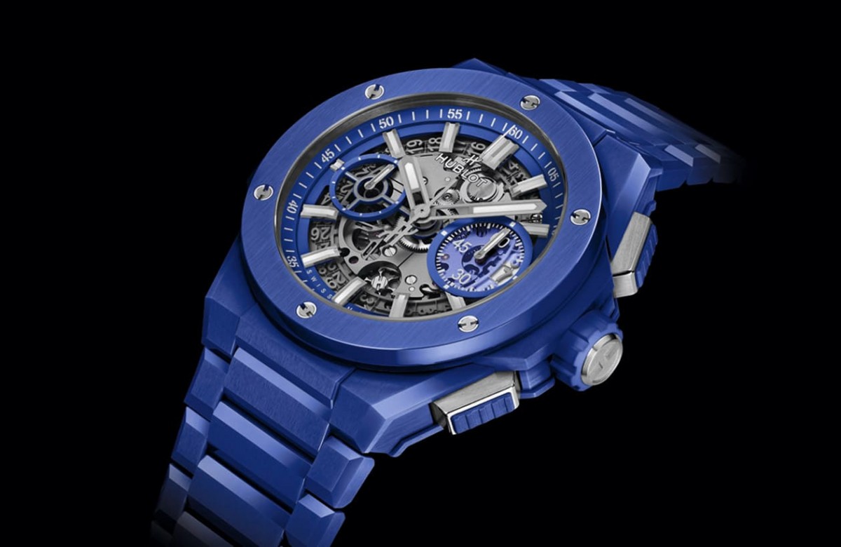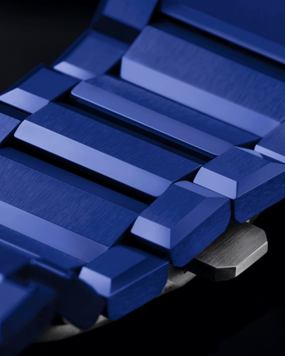而宇舶也趁胜追击地在2021年追加白色、蓝色与灰色款式,使得陶瓷材质瞬间成了BBU链带计时码表的主力材质;迈入2022年后品牌又再延伸出4种彩色陶瓷款式,包含前两年先登场的作品在内,目前光是BBU全陶瓷链带表就已经拥有多达8种顏色可选,其中蓝色系就佔了将近一半比例,除了看准蓝色是高级手表市场人气不灭的长青色之外,从中也显现出宇舶研发彩色陶瓷材质炉火纯青的技术,让他们总能在同色系中发展出深浅不同的新色调。