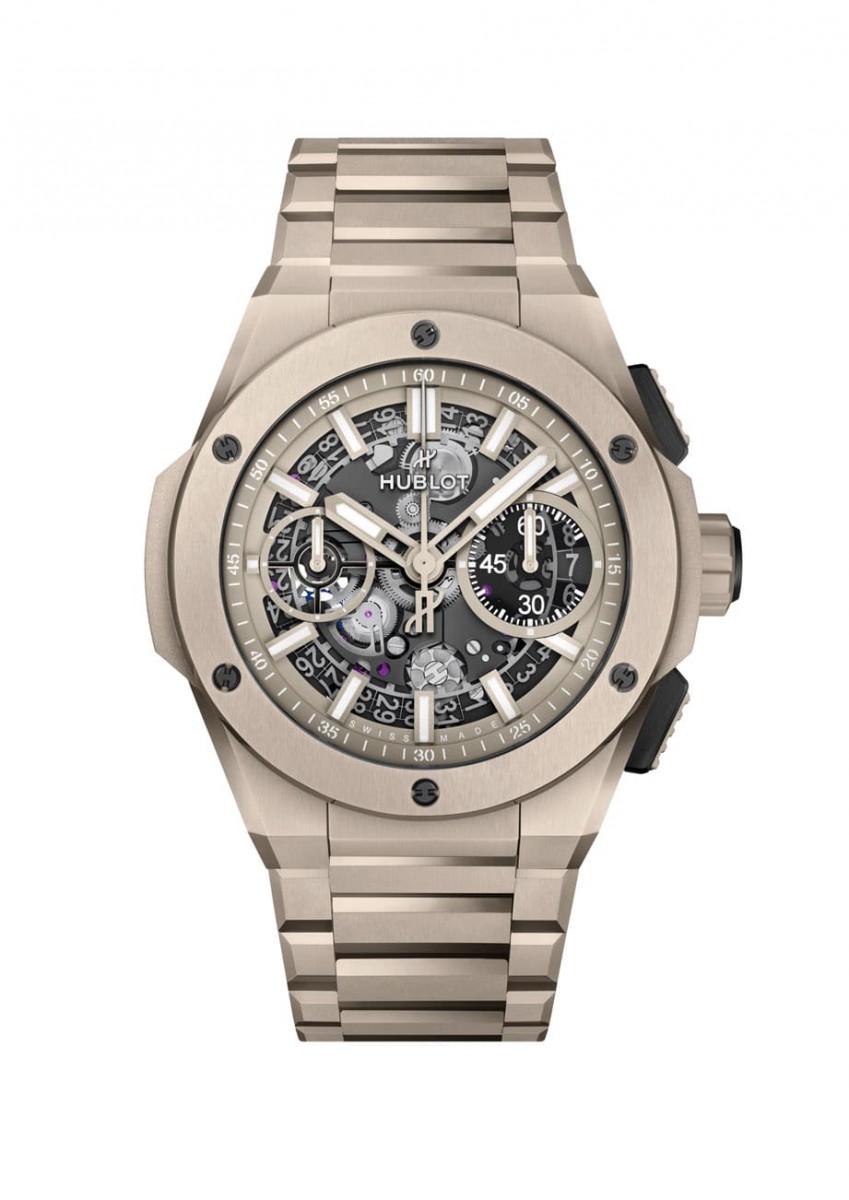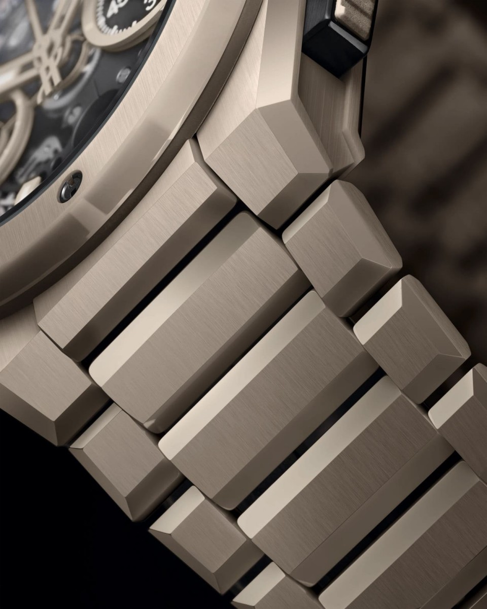 Big Bang Unico Integral在2020年出道时便已经拥有黑色陶瓷款式让人眼睛一亮,因为大爆炸系列的三明治表壳结构向来以层次感与繁复切面闻名,宇舶採用陶瓷材质制作手表表壳已经是充满挑战性的尝试,何况表款的表带同样是用陶瓷零件一节一节组成,加上Big Bang Unico Integral重新塑造出品牌链带的造型基础,链节延续手表计时按把的线条设计且品牌又以拋光和拉丝双重工艺修饰,使得手表光是制作、塑造与组装外部的陶瓷零件便已经很耗时费工,这也是为什麼BBU链带计时码表一推出时,相较于另两款钛金属与皇金款,黑陶瓷款受到的瞩目程度更高的原因。