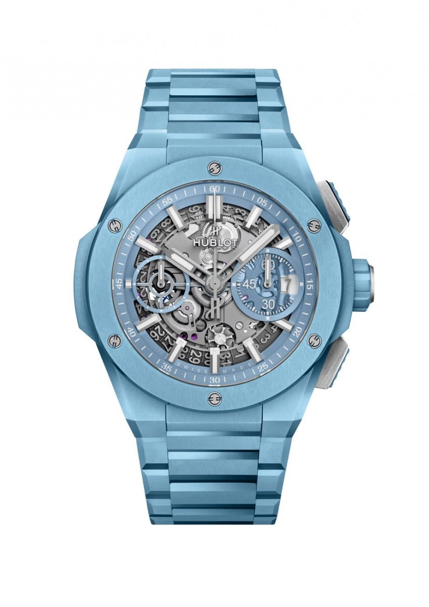2022年新登场的Big Bang Unico Integral陶瓷链带计时码表共有4种顏色,据说品牌是从热带国家或地区的城市以及景物获得灵感,例如靛蓝色是从摩洛哥着名景点马若雷勒花园(Majorelle Garden)中的蓝色建筑取材,天蓝色则代表着我们在南太平洋望向天空所拥抱着碧蓝景色,砂砾米色则是与加勒比海邻近沙滩为主题,至于丛林绿的源头可能不用解释太多,要说到地球上最有名的丛林,当然非南美洲的亚马逊雨林莫属,因此宇舶新推出的4款Big Bang Unico Integral陶瓷链带计时码表分别象徵热带地区的着名景致,这让手表不只视觉效果明艳动人,在赏表时若能先知道这段设计渊源,更能对手表的绚丽顏色有更深一层的了解。