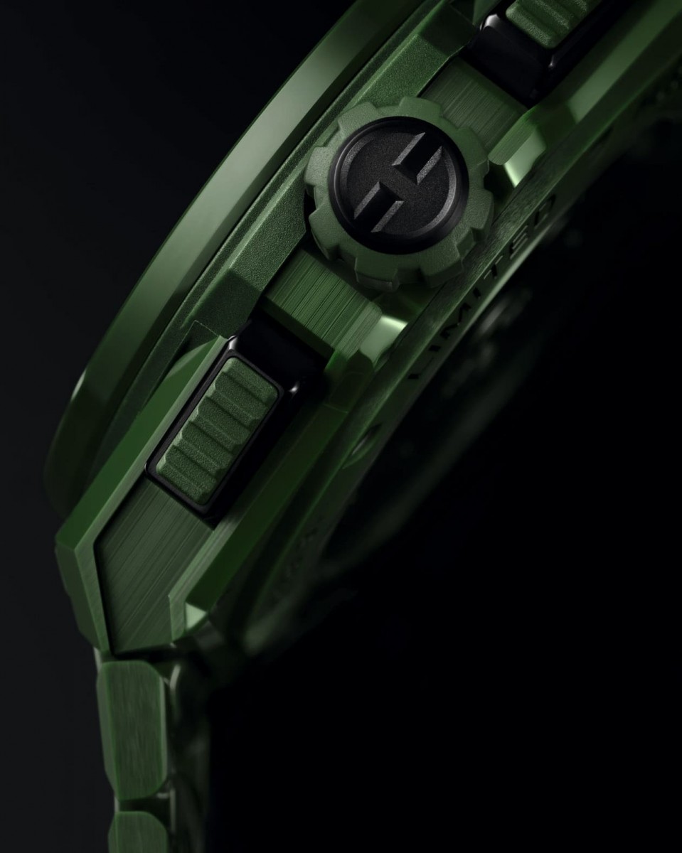 ▲包括计时按把以及表冠都有呼应表壳与链带的同色材质,表面起伏的纹路有助于提升摩擦力,操作时更顺手。