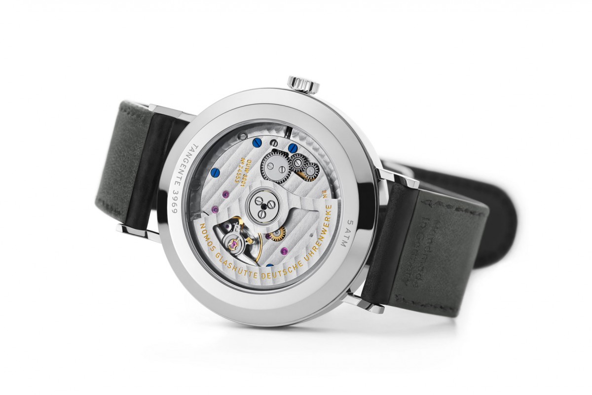 ▲透过蓝宝石水晶透明表背,可欣赏NOMOS专利DUW 3001自动上链机芯的运转。