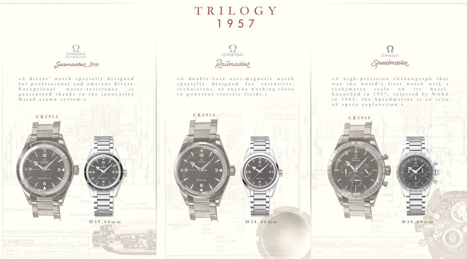 1957年——这年欧米茄创造出着名的Trilogy专业手表三部曲,包括潜水表Seamaster、赛车表Speedmaster和抗磁表Railmaster。
