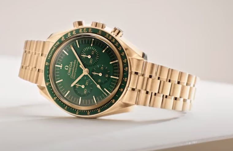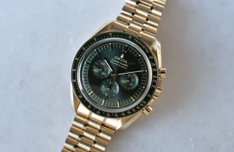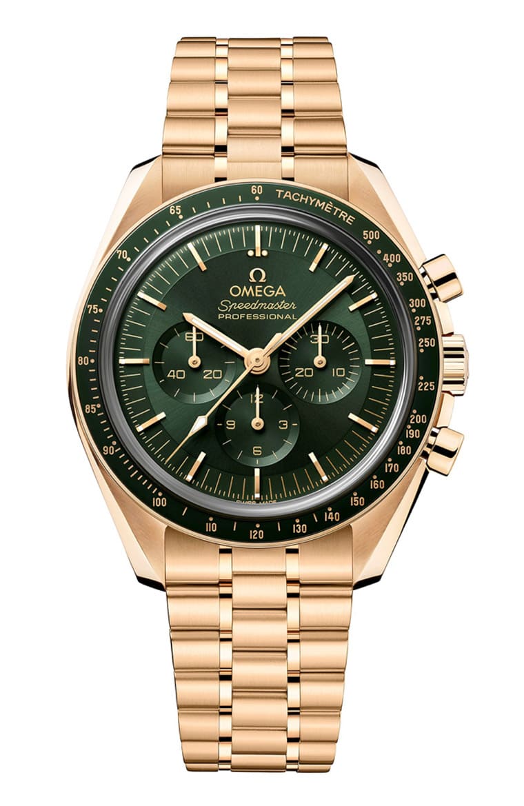 OMEGA欧米茄超霸系列着名款式Moonwatch登月表前几年换上新生代的3861机芯完成世代交替,透过机芯与手表外部的新细节,让登月表这个一代经典深度进化成更符合现代所需的产品。登月表刚大改款那年欧米茄一口气推出了不锈钢、Sedna™金和Canopus Gold™金等3种材质款式,且不同表壳间又还有表带以及镜面材质的个别差异,从而衍生出丰富的家族成员。本以为欧米茄同步发表这麼多款登月表,应该足以让市场陷入选择困难症(咦)好一阵子了,没想到欧米茄隔年依旧保持满满的创作能量,进一步开发出採用Moonshine™金材质的登月表,瞬间让登月表家族变得超级热闹,跳脱过往是以不锈钢为主的刻板印象。新款Moonshine™金登月表分别有黄金面与绿面两种版本,其中后者搭上近年的热门色主题,且黄金色的表壳搭配绿面又隐隐让人想起表坛中另一款强势表款,成为近年市场上众多金表中最耀眼的明星之一。