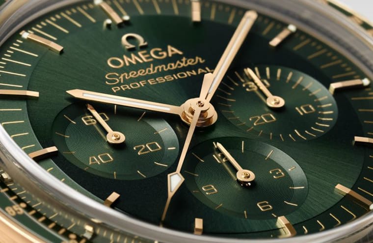 过往提到登月表我们第一时间想到的就是黑色面盘,然而时代在变,手表的设计也会做出与时俱进的改变,从2021年开始,欧米茄就针对Canopus Gold™金款式将面盘改为白色,到2022年更上层楼陆续引进包含绿色在内的顏色。这可能会引来两极的评价:传统派会认为登月表面盘换了其他顏色就少了点历史传承的韵味,但是也有另一派的人则是乐观其成,看到经典表款可以出现过往未有的尝试,有助于吸引更多手表爱好者的注意。Moonshine™金登月表採用的绿色是偏深绿的色调,看起来成稳而高雅,与高调的黄金色泽表壳搭在一起形成鲜明对比感。而且面盘由于经过太阳放射纹修饰,所以绿色会随着佩戴者转动手表的角度与光线照射而有深浅变化,看起来相当吸引人。