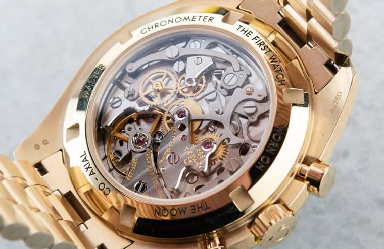贵金属款的登月表一律採用透明底盖,如此才能烘托出3861机芯这个重要焦点,不过和阿波罗11号50周年时那款Moonshine™金登月表有点个别差异的地方在于前作的3861机芯蕴含K金零件,这款Moonshine™金登月表搭载的3861机芯则是用一般金属制作零件。虽然零件材质不同,但是3861机芯本身的规格与特点都不变,其大致承袭1861机芯的优点,不过欧米茄在机芯结构中导入Si14硅晶体游丝等抗磁零件,确保手表的抗磁能力达到大师天文台认证要求的>15,000高斯水准,一举将手表品质提升到更高的层次,即使手表的震频(3Hz)以及动力储存(50小时)皆属比较「老派」的风格,但是机芯的抗磁性跃进、加入停秒功能等,都有助于优化手表的走时精准度,对于会选择登月表的玩家而言,Moonshine™金登月表维持传统的特色不仅不会显得过时,反而更是吸引他们入手的原因。