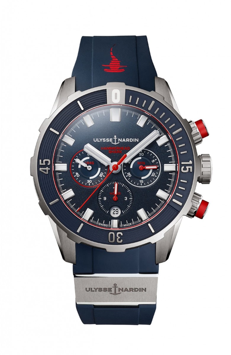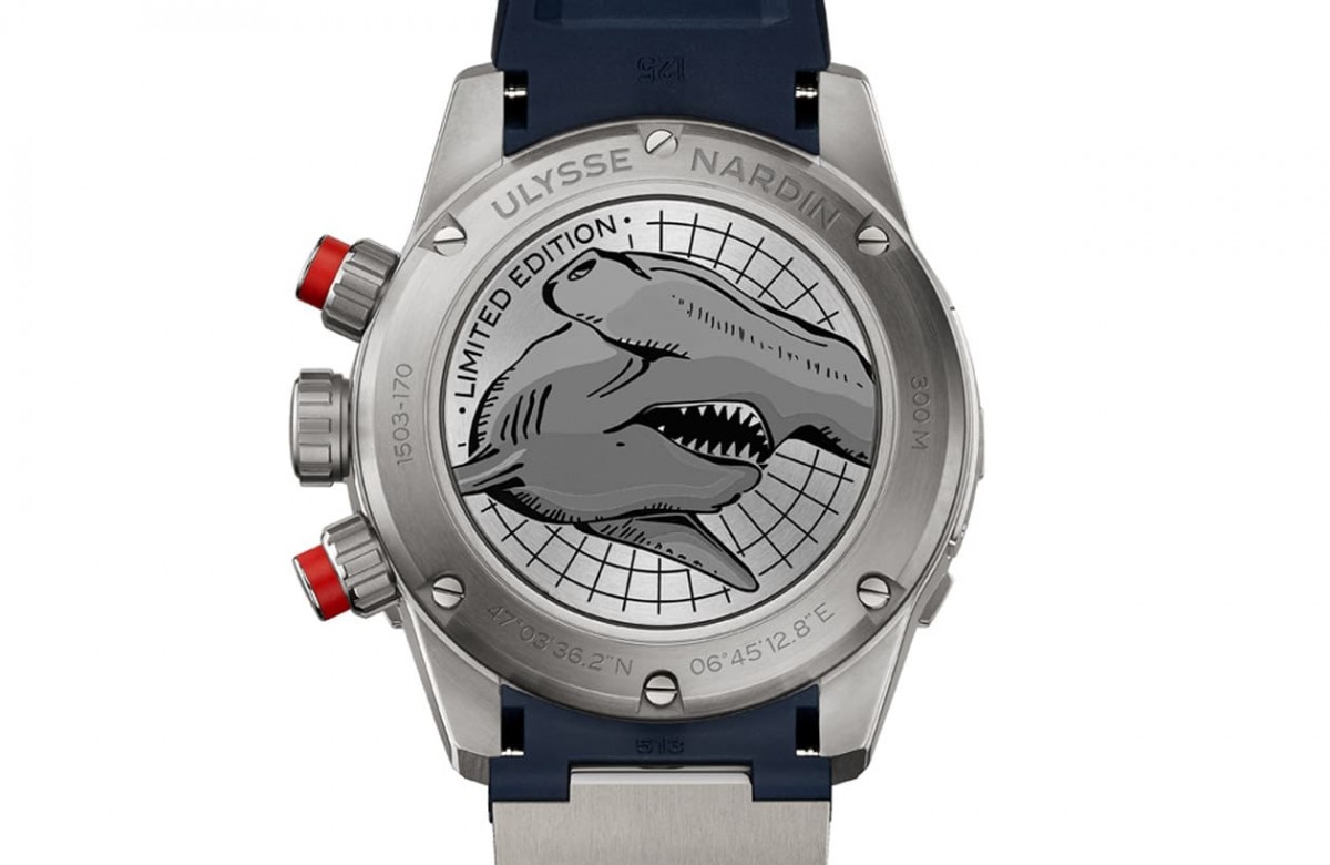 潜水系列限量锤头鯊计时码表的实底盖印有一头锤头鯊图案,在鯊鱼后面额外鐫刻一种特殊的网格线条,使得锤头鯊图案更具有一股蓄势待发的水中悠游动态感,图案传达出大胆和自信的精神,犹如佩戴者能够安心戴着它从事水下活动,强悍的规格与鯊鱼在水中的威能刚好对应。一如雅典表先前创作的锤头鯊联名表,这款作品同样搭载UN-150自动上链机芯,拥有硅质擒纵装置和48小时动力储存空间,尤其前者攸关腕表走时精准度,也是佩戴者在水下能有效控制停留时间的一大关键。