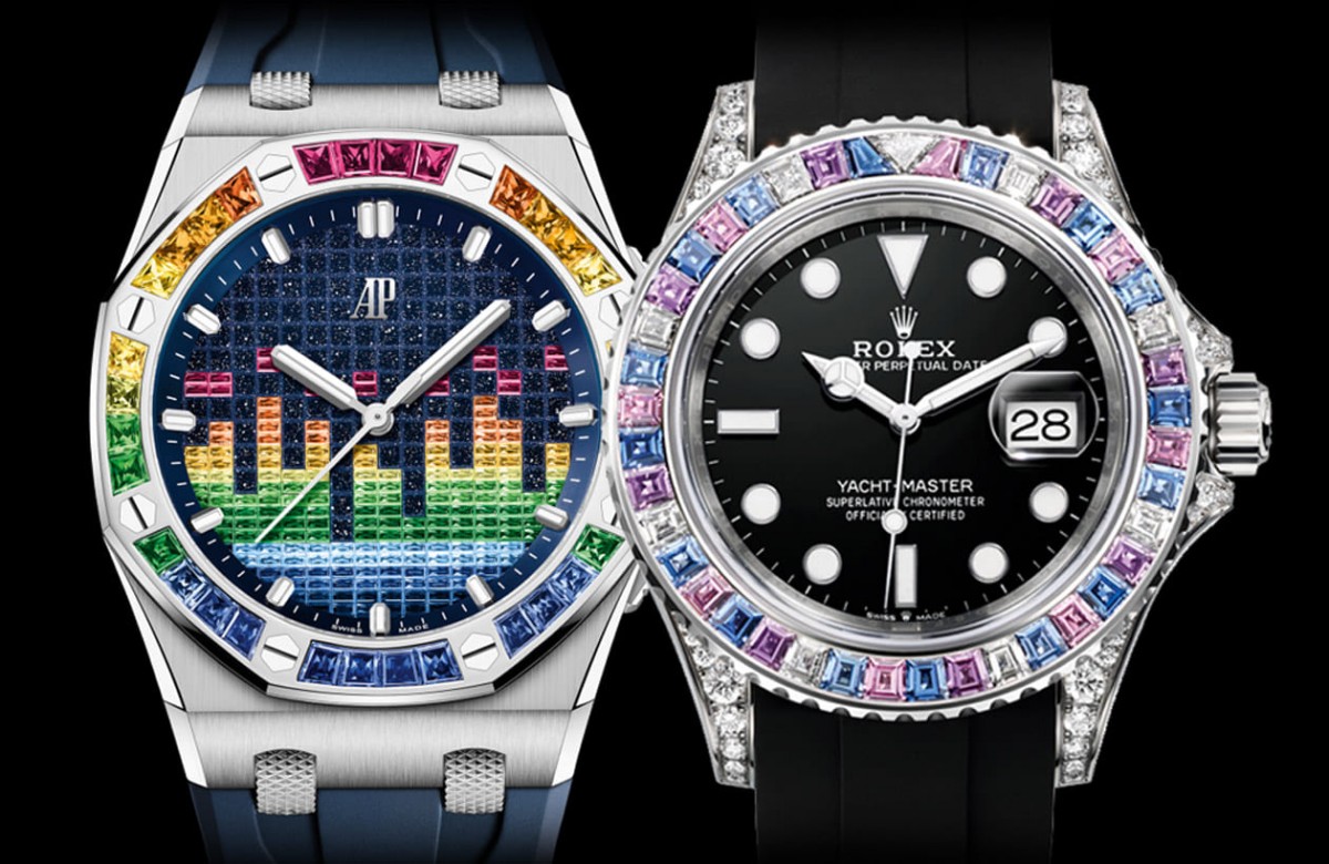 高级手表加入钻石与宝石元素算是稀松平常,但在过去几年因为劳力士Daytona 116595RBOW在市场掀起一股旋风,连带使手表前作116598RBOW跟着爆红,形成一股赏心悦目的彩虹圈风潮;影响所及,一些高级品牌也纷纷创作出属于自己的彩虹圈作品抢市,而虽然这种类型的手表基础架构类似,例如在贵金属表壳和表圈镶上彩色宝石,但是每个品牌用来诠释彩色宝石的作品各有彼此的个性、使用的宝石顏色也不尽相同,有的像116595RBOW接近彩虹般的繽纷,也有的搭上特定创作主题,用顏色呈现特别的意境;无论是哪一种形式的彩色宝石圈手表,可以肯定的是它们的顏值都会比一般手表更高,彩色宝石一方面有其稀有的收藏价值,更重要的是其色彩能够作为手表外观绝佳的装饰元素,有时候即使是同一款表,有没有加上彩色宝石表圈,散发的视觉感受也会出现截然不同的感受,难怪即使这类作品价格相对高昂,依旧能吸引到高级手表收藏家与名人的喜爱,前仆后继加入这股彩色浪潮中。近期表坛陆续出现几款彩虹圈或类彩虹圈手表登场,编辑部从中挑选两款知名品牌的得意之作,看他们如何用彩色宝石演绎本已耳熟能详的热门表系列。