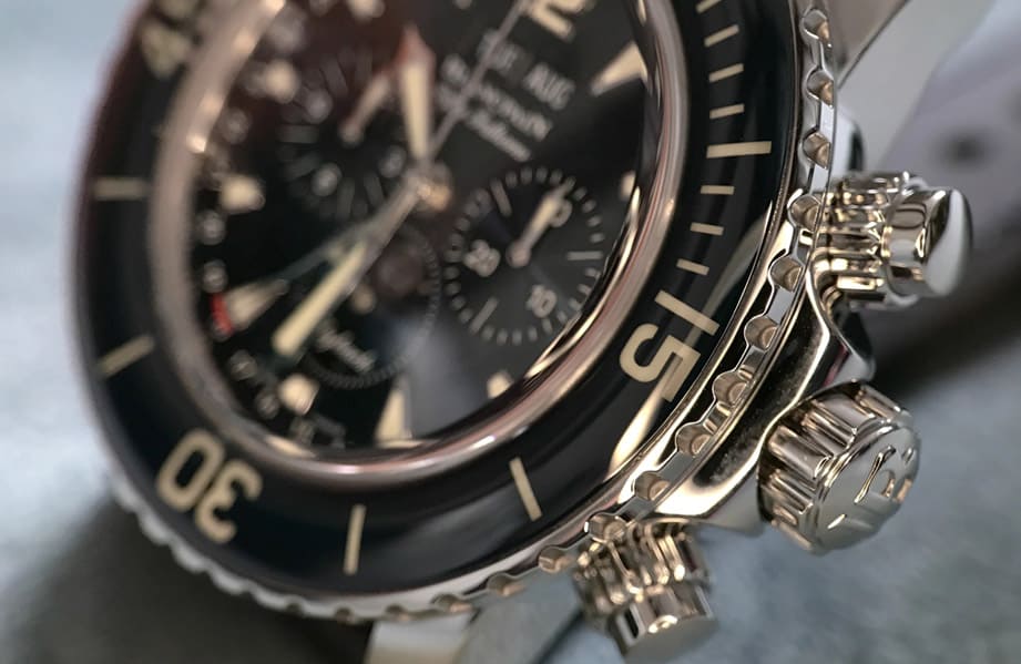而且还要注意一点也不是每款潜水计时码表都会採用旋入式按把,基本上如果没有旋入式按把设计,那就更不要在水中启动按把,因为这就有点像是自己引水入表般是种自我伤害的行为,总之回归到文章开头的问题,拥有计时码表功能的潜水表,即使号称防水性超过300米以上也不要启动计时按把,基本上在水中还是利用表圈计算时间就好,至于计时码表功能嘛⋯⋯等到上岸后还是有大把时间可以体验它的触感和运作品质,不急着在水下冒险尝试以免得不偿失。