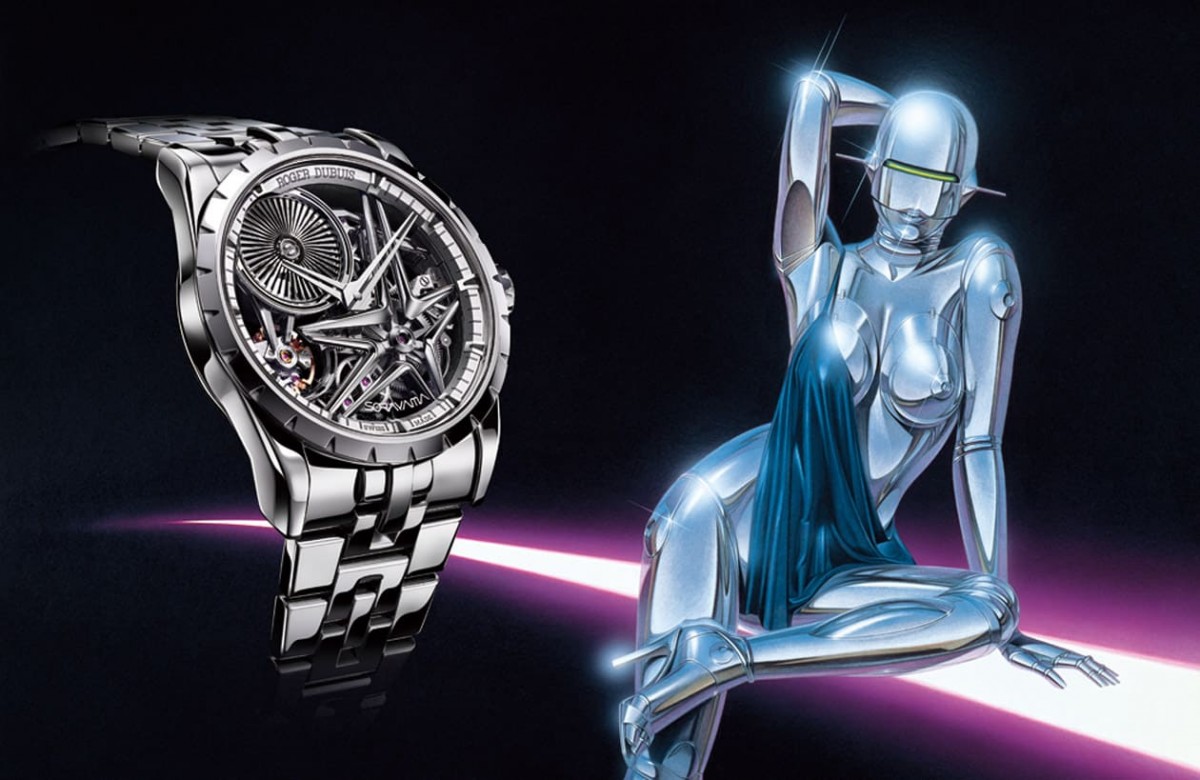 近期罗杰杜彼则和城市艺术族群展开合作,由于品牌发现双方在厚植专业技艺、追寻未来设计的目标等层面都有高度相似之处,因此短期内先后和洛杉磯知名纹身艺术家Dr. Woo、法国艺术家Gully合作,紧接着又找上日本赫赫有名的插画家兼雕塑家空山基(Hajime Sorayama)跨刀参与创作,透过艺术家视角重新诠释罗杰杜彼备受市场喜爱的Excalibur Monobalancier王者系列单摆轮腕表。