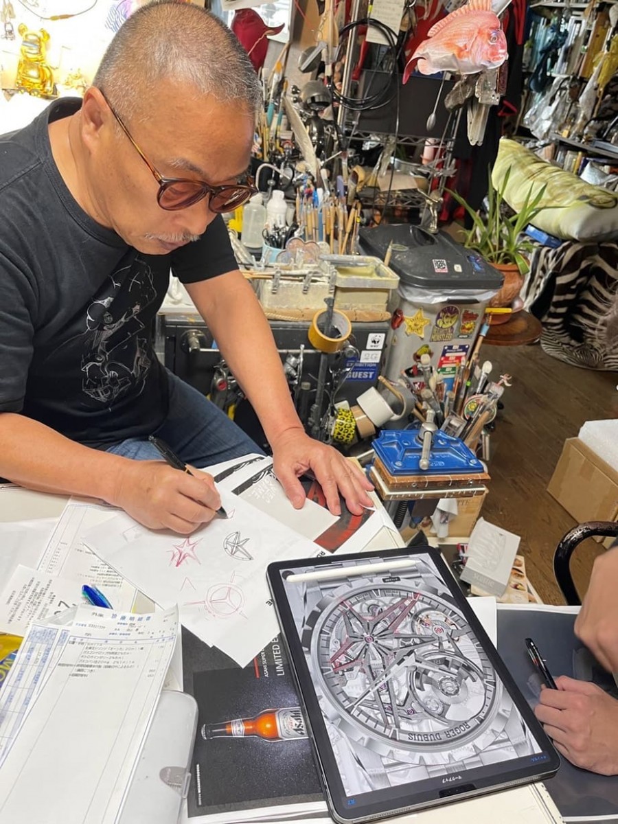 ▲结合艺术家个人风格的内外线条、点缀摩尔波纹的微型自动盘,此联名特别版散发强烈「空山基」视感。