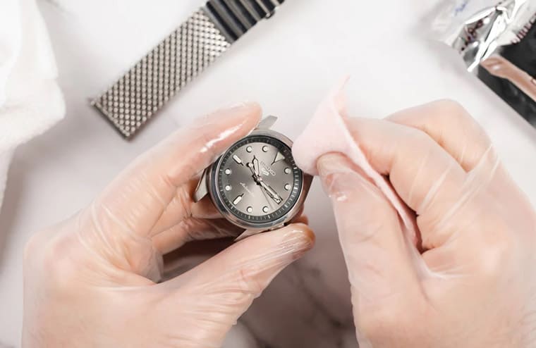 看似帮手表恢复光泽的动作也有可能造成手表刮伤,所以当我们想要擦拭手表时,要先确认擦表布是否乾净?裡面会不会吸附了很多灰尘颗粒,假如表布本身不太乾净,我们再拿它来擦表,反而可能会在表壳上留下一些刮痕,而在手表乾燥时清洁手表时更要尽量放松,不要太用力,当我们拿表布摩擦手表的次数越多,污垢就越有可能积聚在布上并最终划伤手表。温馨提醒一下,如果你的手表外观有经过拉丝处理,其实拿所谓的拋光布去擦表的实质意义不大,在这方面就可以省点力气了。