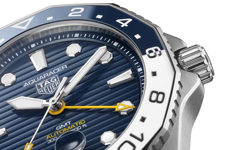 表款经典的水平甲板纹面盘採用深蓝色背景,搭配涂覆白色Super-LumiNova®夜光涂料的指针及时标,并以亮黄漆釉点缀中央秒针尖端与整枚指针皆为亮黄漆面的GMT指针,这些色彩的搭配乍看自然和谐,其实蕴含泰格豪雅严谨的设计概念,品牌透露这些顏色分别是从蓝天、艳阳、海水以及岸边捲起的浪花等元素擷取而来,赋予腕表一股崇尚自由、来去自如的奔放个性,这些特质完全符合它本身的潜水表格调。