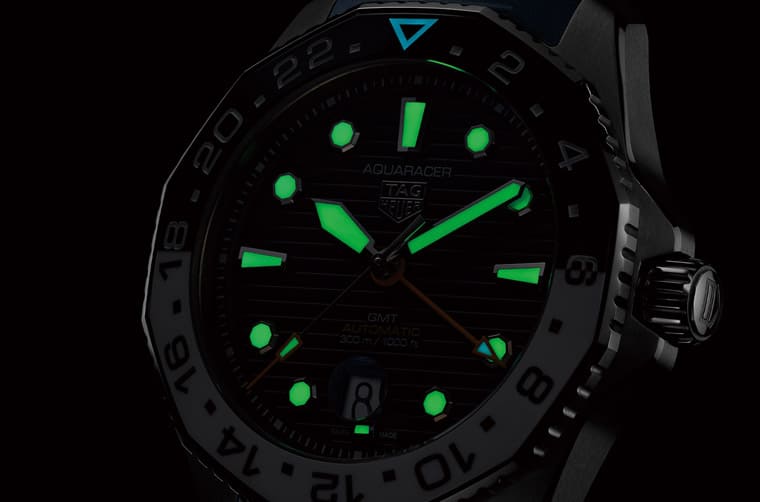 Aquaracer Professional 300 GMT採用不锈钢材质制作表壳,表径达43mm,表圈则以坚硬耐刮且不会褪色的蓝、白双色陶瓷制成,其中蓝色部分代表晚上6点到早晨6点,白色部分则是表示早晨6点到晚上6点,搭配表圈改为双向旋转的设定,让佩戴者可以更一目了然并且灵活运用腕表的两地时间功能。 陶瓷表圈可以说是这表款的一大亮点,除了双色设计颇为独特之外,泰格豪雅也分别在两色表圈部分採用高对比感的白色与黑色进行搭配,尤其18与6这两个数字因为刚好介于表圈顏色转换的交界,因此它们的黑白两色也换随着表圈顏色变化同步转换,细节中展现品牌讲究的制表态度。
