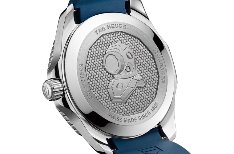 Aquaracer Professional 300 GMT承袭系列传统,使用实底盖设计以确保腕表拥有更彻底的防水效果,底盖鐫刻六边图形衬底,并加上自2004年首度出现在Aquaracer系列手表底盖以来,主题就不曾变动过的Scaphander潜水头盔图案,藉此暗示腕表拥有专业潜水表标准的防水性能,不过要注意的是目前潜水头盔乃是2021年改款后的版本,加入一点新时代风格让腕表与原本的设计呈现同中求异的样貌。表款搭载Calibre 7 GMT自动机芯,这枚机芯具有50小时动力储存,除了三针与两地时间功能外,还在6点钟位置设有放大日期显示,实用性不在话下。泰格豪雅分别替腕表配置了不锈钢链带和深蓝色橡胶表带两种版本,让人可以从中挑选出适合自己的腕表个性,且它们的设计都允许佩戴者在穿脱潜水衣时可以轻松调整佩戴,不过不同表带材质间,腕表的定价也会有一些差异,入手前可要先做好功课。