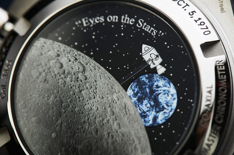 前两代的超霸史努比登月表表背都是放上静态的元素,例如彩绘图案或金属雕刻,发展到第三代则有了重大突破,首先它已经换成了3861机芯,与前两代搭载的1861机芯有世代差异;而在表背部份更是有连动到机芯的独特设计,光看表背会注意到欧米茄在上头方上了近景的月球图案与远景的地球图案,中间则是布满闪亮星星的宇宙,还有一只正搭乘太空船的史努比,仔细看可见这个场景本身是层叠的立体结构。每当佩戴者启动计时功能,随着中央计时大秒针运作,表背的史努比与太空船也会开始逆时针徐徐往前推进,当史努比图案前进到月球图案时会「隐没」到月球裡面,直到它飞回宇宙后才会再从地球上空掠过,过程中只要暂停计时功能,史努比图案也会立刻停止,归零后它又会回到原本接近表背11点方向的位置。有趣的是,如果你仔细计算史努比经过地球的过程,会发现它需要费时14秒——这刚好就是阿波罗13号任务中太空人返航关键所需的关键秒数设定。