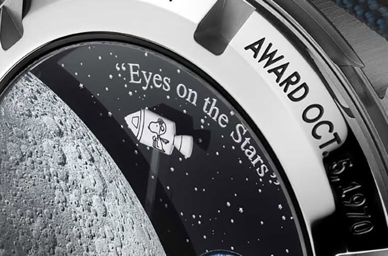 第三代超霸史努比登月表表背史努比图案上方印有“Eyes on the stars”,同意的字句在第二代表背边缘也可以找到,包括第一代表背的银史努比奖章图案上方又再次出现这段话,其实这话出自于第26任美国总统老罗斯口中,全文是:“Keep your eyes on the stars and your feet on the ground.”(眼睛盯着星星,可是脚踏实地),这代表NASA对于冲上太空的态度,大胆做梦之餘,也要先务实地做好眼前一切环节,也有可能带领人们从地上进入太空。回顾美国的太空计画历史,1967年阿波罗一号试射那场意外犹如当头棒喝,使得NASA后来在面对每一次任务时都更小心谨慎,即使日后面临阿波罗13号任务这样的危机情况,因为事前准备充份,使得太空人最终找到生机平安返回地球,所以这段佳句也成了贯穿历代超霸史努比登月表的重要元素,未来就算品牌再延伸出后继作品,应该还是可以见到相同的字句不断出现。