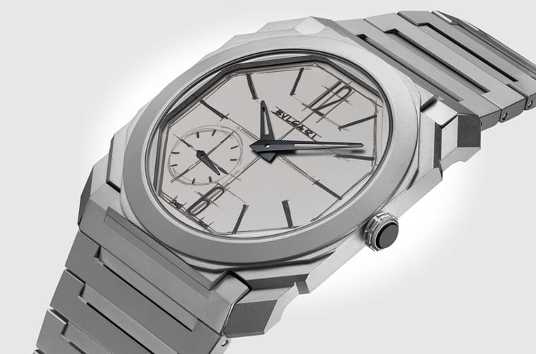 ▲宝格丽Octo Finissimo超薄自动表採用5级钛金属表壳,表面经过喷砂处理。