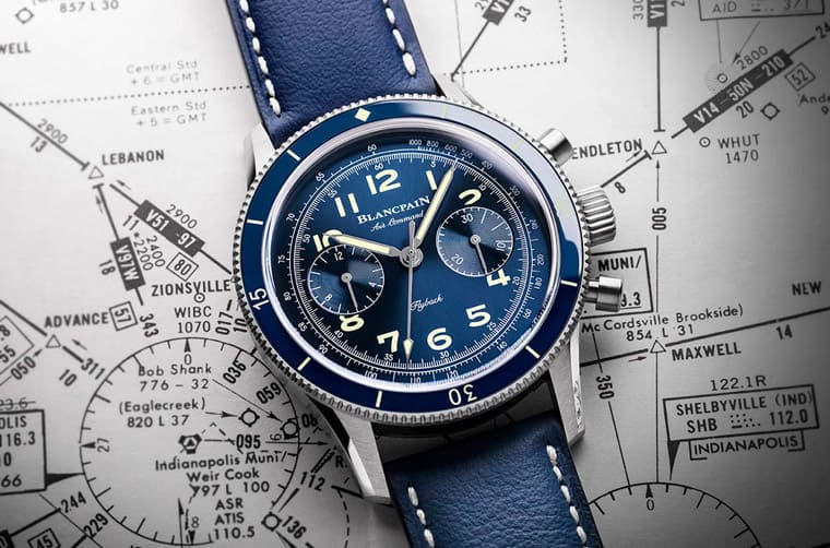 ▲宝珀的Air Command飞返计时码表以少见的23级钛金属制作表壳。
