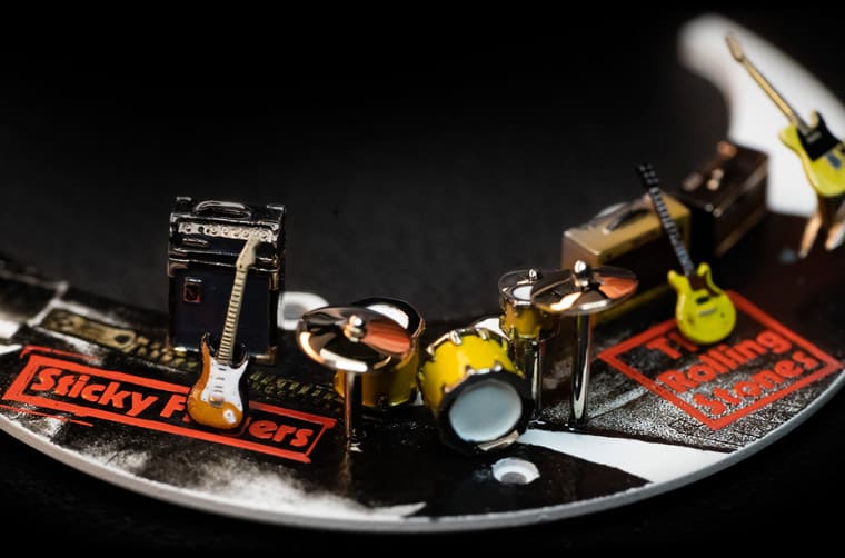 ▲黑玛瑙小表盘下缘的面盘设置了滚石合唱团成员的微型立体乐器装饰,从吉他、鼓组到键盘都有。