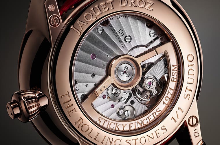 表背透明底盖露出手表搭载的2653 AT2机芯,底盖下缘鐫刻”THE ROLLING STONES 1/1 STUDIO”字样,另外镂空红金自动盘下缘也刻有”STICKY FINGERS 1971 RSM”字样,意指1971年他们的同名专辑,这张专辑是第一张放上其滚石录音商标的作品,具有相当程度的代表性(注意到第二层面盘的乐器组底图背景其实也就是Sticky Fingers的封面照了吗)。机芯本身蕴含硅游丝和马仔,震频4Hz,并透过双发条和输出68小时动能,底板表面和摆轮桥板都加上环形日内瓦波纹修饰,展现品牌百年大厂的工艺风范。