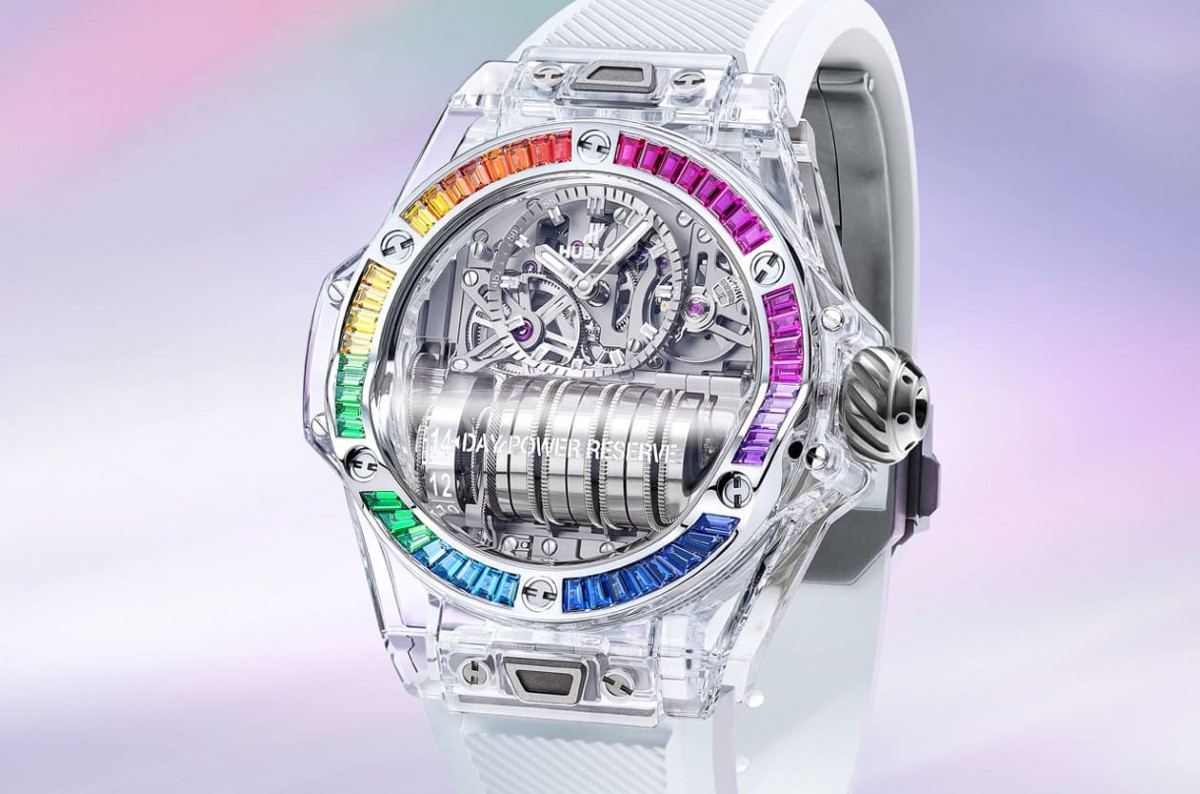 绽放无色透明表壳彩色视觉魅力——Big Bang MP-11彩虹蓝宝石手表