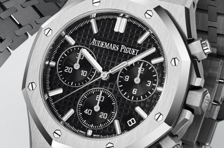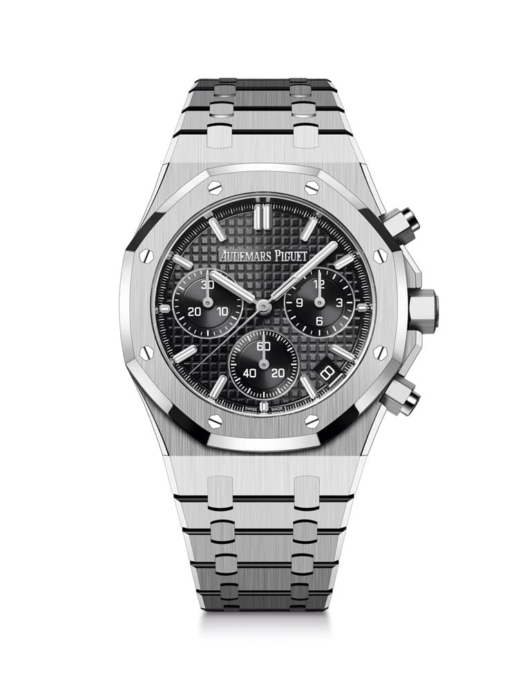 皇家橡树系列自动上链计时码表与其他同期的RO新款相同的部分还有面盘细节的改造,品牌为了加强系列整体的统一感,因此不同功能、尺寸的RO手表,它们的时标与指针如今都採用统一的尺寸。再来爱彼也将前几年首度应用于CODE 11.59系列的电镀生成法(类似3D列印)Logo移植到皇家橡树系列中,取代旧款并用立体AP Logo及印刷爱彼Logo的作法。 41mm皇家橡树系列自动上链计时码表阵容相当丰富,共有超过十款的选择,像是不锈钢黑面这种设计又是其中百搭耐看的人气选择,表款的Grande Tapisserie格纹面盘採单色面盘设计,品牌似乎在单色-双色的循环中再度轮换到採用单色面盘的时机。