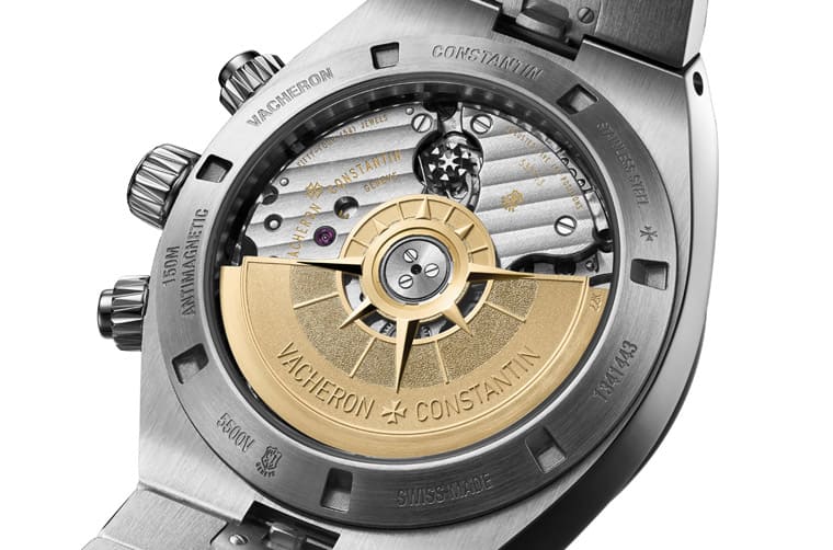 Overseas计时码表表背透明底盖可见手表搭载的5200自动机芯,其22K金自动盘饰有呼应系列旅行精神的风向玫瑰罗盘图案、机芯底板以日内瓦波纹修饰,展现符合日内瓦印记要求的高作工水准。表款的计时功能由导柱轮搭配垂直离合掌控,后者的优点在于能够有效降低计时指针在启动时产生的颤动情况,细看导柱轮会惊喜发现它的造型也含有马耳他十字的概念,整体风格相当一致,至于机芯的品质既然是出自VC手笔,其可靠程度也是公认的优异。