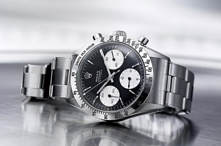 1963年——劳力士首度发行面盘印有Daytona字样的计时码表(型号为6239),当时手表的表壳尺寸为36.5mm、搭载经过品牌改良的Valjoux 72自动机芯,定价约为200美金(现在回头看这数字还真的是不可同日而语)。