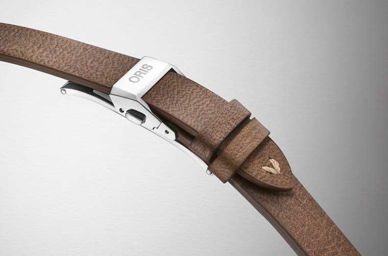 ▲表款搭配Cervo Volante永续鹿皮表带,发扬ORIS推崇的环保理念,翻至表带背面可见一枚昆虫图案,展现表带强调与自然和平共处的精神。