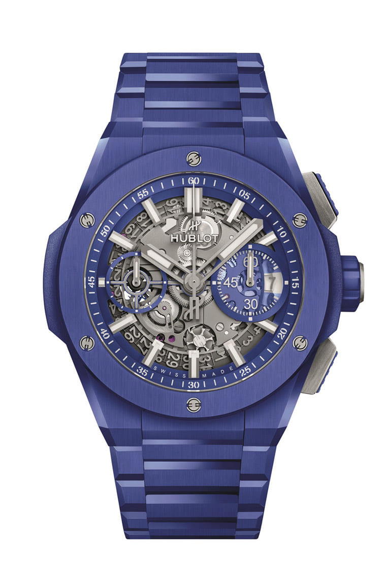 C罗佩戴的Big Bang Integrated透明彩虹圈数量稀少、价格也是顶尖,世上能拥有的幸运儿毕竟还是少数,不过想要感受宇舶链带腕表魅力还是有很多选择。像是Big Bang Integrated链带计时码表就是近年深受市场欢迎的热门作品,这款表在刚出道时就已经推出过陶瓷材质的款式,其后宇舶也持续挹注更多彩色陶瓷,赋予腕表明艳多彩的视觉张力。以Big Bang Integrated陶瓷链带计时码表靛蓝款为例,腕表的表壳与链带皆以宝蓝色陶瓷制成,零件表面经过拉丝处理、边角则经过倒角拋光,除了要调配出异色陶瓷仰赖品牌的独家配分,能将高硬度的陶瓷制作出结构复杂、切面又繁复的大爆炸腕表外观,在在突显出品牌制作技术的成熟。