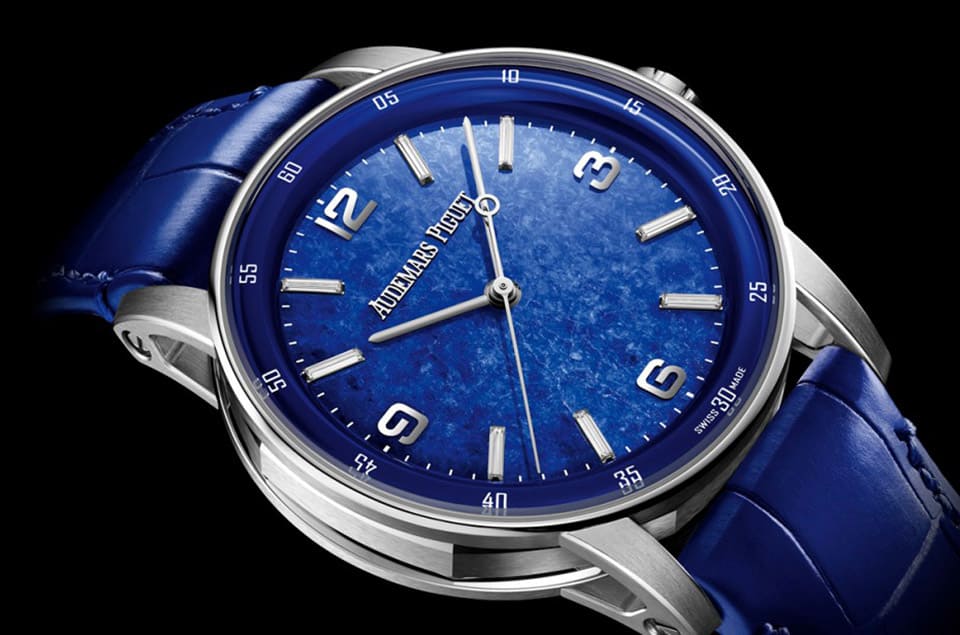 CODE 11.59系列刚出道时,面盘多数採用漆面装饰,爱彼在黄铜材质的面盘基底涂上多层漆料,使其看起来晶亮纯净,近年慢慢出现愈来愈多的变化,例如品牌推出渐层色调或同心圆涟漪纹,抑或高复杂款式也有镂空处理等设计,增添系列作品的可看性。而手表面盘上镶嵌的品牌Logo在制作工序上也有所革新,乍看之下我们可能会以为品牌是将”AUDEMARS PIGUET”等14个K金字母一一镶在面盘上,但实际上这些字母彼此是相连的,爱彼採用的是一种名为「电镀增生」的技术(有点类似3D列印的概念)来制作品牌Logo,字母与字母之间其实透过仅有0.11毫米粗的金线连接,呈现出相当精致的成果。这款CODE 11.59自动表有别于系列多数三针款,它採用方钠石制作面盘,除了3、6、9、12点为白金制阿拉伯立体镶嵌时标,其他方位的时标则镶上钻石点缀,同时原本面盘上的日期显示也一併移除,让方钠石的纹路得以流畅完整地呈现。