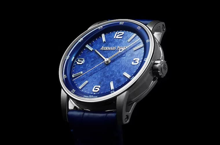 CODE 11.59系列在造型设计上让人有耳目一新的感觉,像是它的表壳正面为圆形、中层则是嵌入八角形隐隐与皇家橡树系列致敬,而且它的八角形还经过拋光与缎面两种处理,视觉层次感相当细腻。表壳侧面在表耳部分进行了镂空处理,表耳下半部与表壳相连,上半部则以焊接方式固定于表圈上,从表侧观之可以发现它带有微微的弧度,这是结合了人体工学设计的考量,让表更服贴于佩戴者手上,据说爱彼光在每枚CODE 11.59表壳的制作上就会花费约5小时,由此可知它比一般圆形表壳的制作难度更高。本次介绍的限量款式表壳为白金,搭配蓝色鱷鱼皮表带展现出亮眼的外观形象,而且它的面盘和系列同功能的作品相比,又明显有更吸引人的元素在其中。