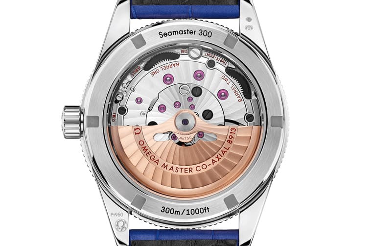 铂金青金石面盘的Seamster 300自动表搭载的是8913大师天文台同轴擒纵机芯,这枚机芯还有另一个版本为8912,两枚机芯主要差别在于8913机芯採用了18K Sedna金自动盘和摆轮桥板,至于固定螺丝和摆轮等则都经过镀黑处理。另外机芯配置双发条盒可以输出60小时动能,震频则为25,200vph,当然既然掛上大师天文台的名称,这代表表款的抗磁性能也来到15,000高斯的水准。它在基板上和K金自动盘上皆饰有阿拉伯式日内瓦波纹,相较其他品牌的机芯修饰带有明显的「O记」风格,随着光线照射和角度变化会呈现迷人的光芒,翻到表背在透明底盖下能够一窥机芯的结构与作工。