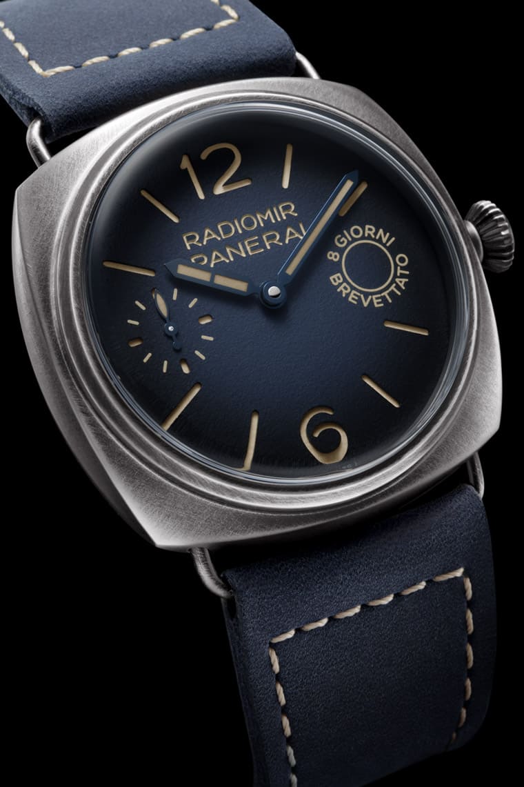 Radiomir Otto Giorni虽然一样用钢材制作表壳,但它採用的是eSteel™这种品牌新研发的不锈钢材质,在制作过程中沛纳海从钟表界和其他工业领域回收刚材重新炼制成新的eSteel™再生金属,视不同款式其eSteel™表壳成分最多可能会有95%都是用再生金属制成。这种科技材质于制作过程中可以大大降低的二氧化碳排放量,符合沛纳海注重永续发展的品牌理念。不只是表壳金属本身的制程有别一般,Radiomir Otto Giorni的表壳也经过手工打磨修饰再加上PVD真空离子镀膜保护,所以第一眼看到手表别以为它是有一点年代的老表,表壳与表圈上的痕跡并非瑕疵而是品牌刻意为之的「旧化处理」,带有向Radiomir历史致敬的用意。PAM01348配置深蓝色牛皮表带,包括表带上的表扣同样是Brunito eSteel™材质,让手表的复古感能够完整贯彻。