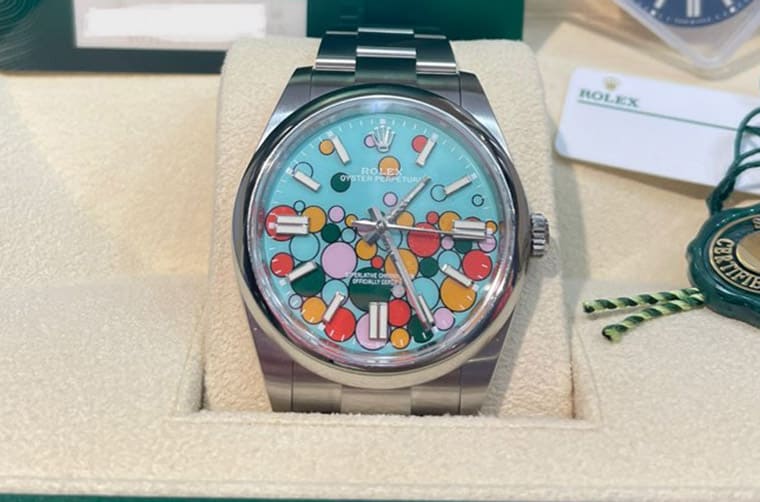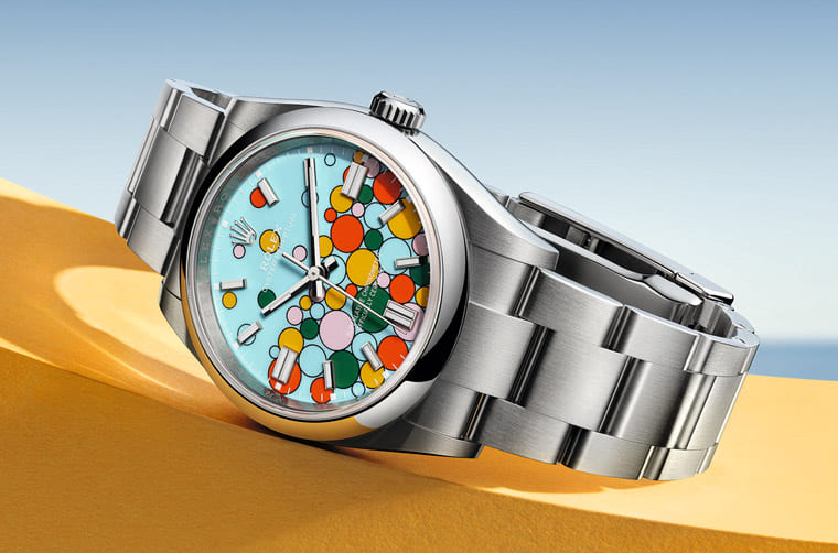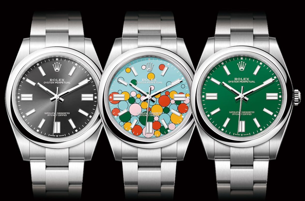 ▲Oyster Perpetual系列2023年将前几年彩色漆面的五种顏色匯聚在单一表款上,形成繽纷亮眼的「庆典」(Celebration)面盘图案,到了2025年随着新的素色漆面登场,彩色气泡面也确定停产。