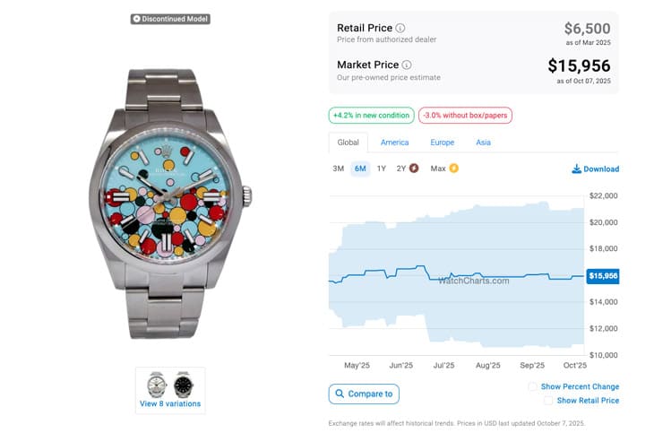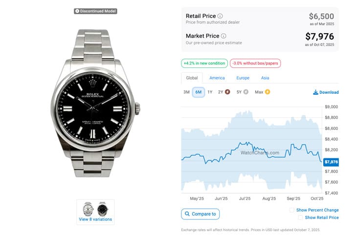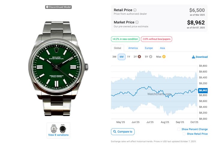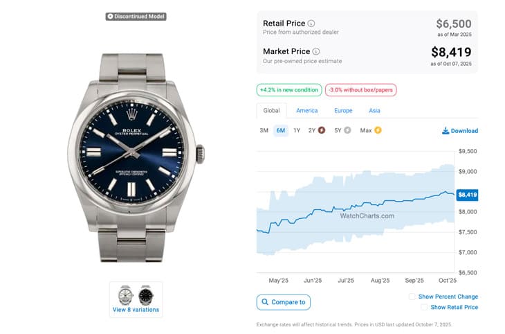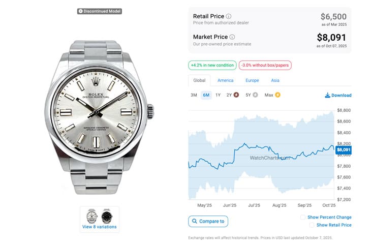 目前41mm的OP手表包括彩色气泡面在内,各种顏色面盘款式的行情经过三年来的撞墙期后原本都已经有所下调,但是自从2025年4月钟表与奇迹表展登场,确定新型号上、旧型号下之后,这些41mm的OP手表大多数二级市场价格都因此而受惠冲高一波,约有一半型号近期身价维持半年来的相对高点。根据高级手表市场调查研究机构WatchCharts的资料,目前这些停产型号从银面、黑面、蓝面、绿色漆面到彩色气泡面的二级市场价格依序是8,091美金(约合台币24万6)、7,976美金(约合台币24万3)、8,419美金(约合台币25万6)、8,962美金(约合台币27万3)和15,956美金(约合台币48万6),这些数字有六成都比一个月前上扬,黑面和彩色气泡面则是不进反退,成了逆风低飞的案例。