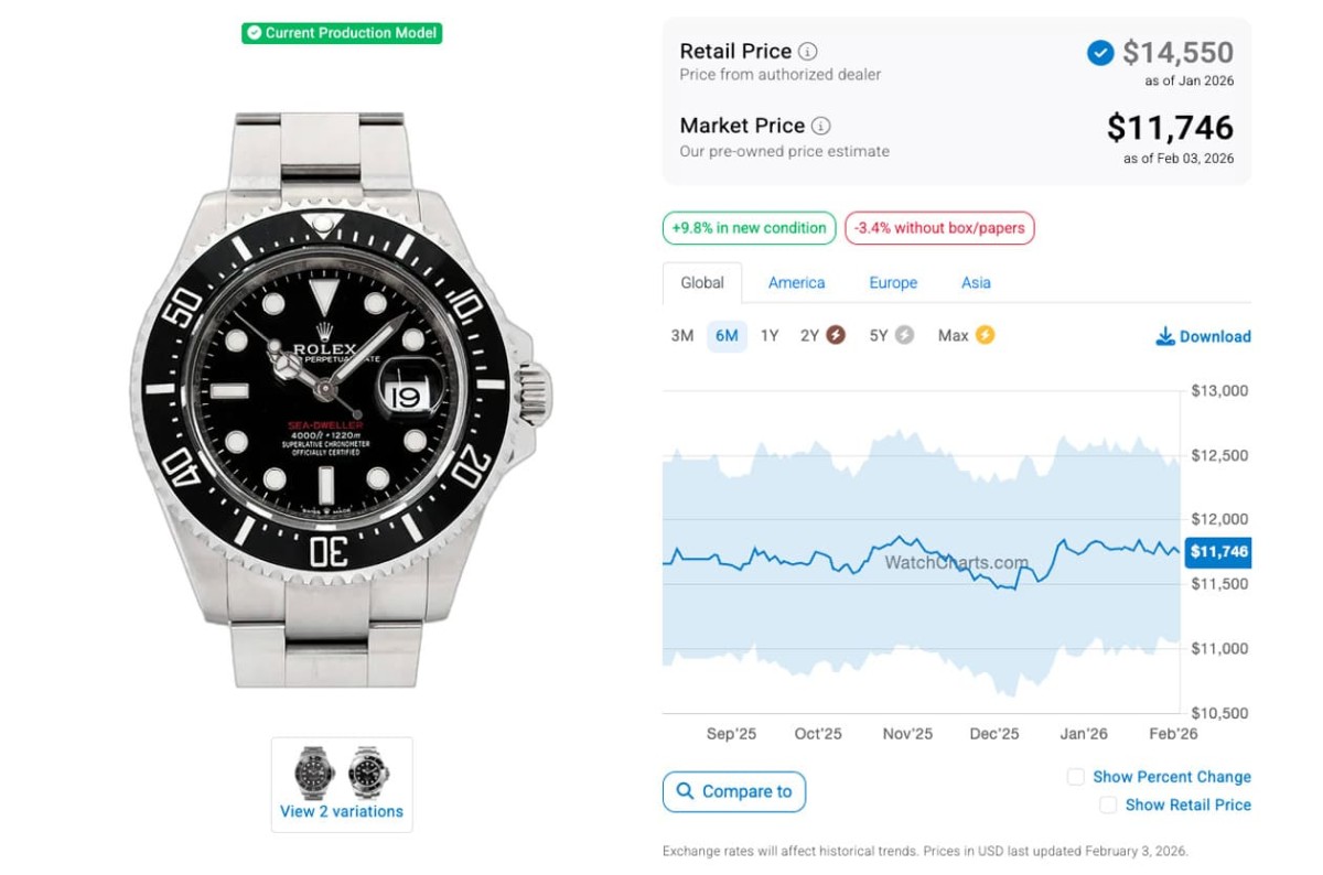 而在过了半年左右的现在,同样由WatchCharts观察到的海使系列市场价格曲线,我们会发现两款表走跌的情况逐渐缓和,近期它们的发展大同小异。目前126603仍旧处于定价以内(国外最近报价是15,347美金,约合台币48万4),126600也是已经好长一段时间都维持在定价以下,跨年前后开低走高,接着到目前身价都变化不大,行情微微回升至11,746美金(约合台币37万)。后者在2025年了6、7月后持续下跌,8~9月之际曾稍微涨上来,接着到12月中下旬逐渐下滑,如今有点触底反弹的味道;至于前者2025年从6月中旬到8月价格一度有回升,9~10两个月后先跌后涨,11月迄今则是开低走高,目前行情已连三个月前处于半年内的高档。