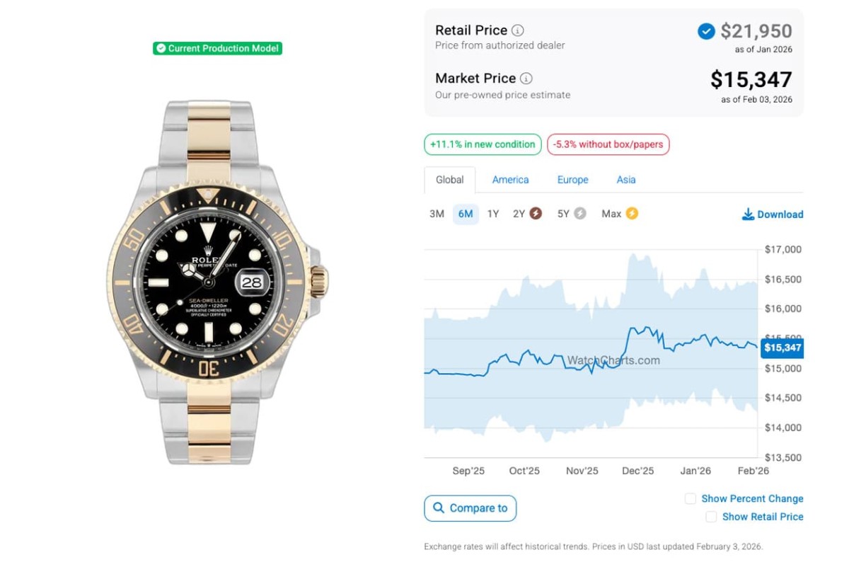 根据高级手表市场调查研究机构WatchCharts的资料,不锈钢表壳的126600在2025年8月时,行情还有11,660美金(约合台币36万7)的水准,但当时已经跌到定价以内;此外半金表壳的126603那时行情也早已经滑落到定价以下的14,924美金(约合台币47万),从二级市场报价中可以看出两款海使的确不算是热门度高的劳力士,或许它们的43mm表径和15.5mm表壳厚度对市场而言还是戴起来负担相对重一些,所以也多少反映在手表的二级市场价格上。