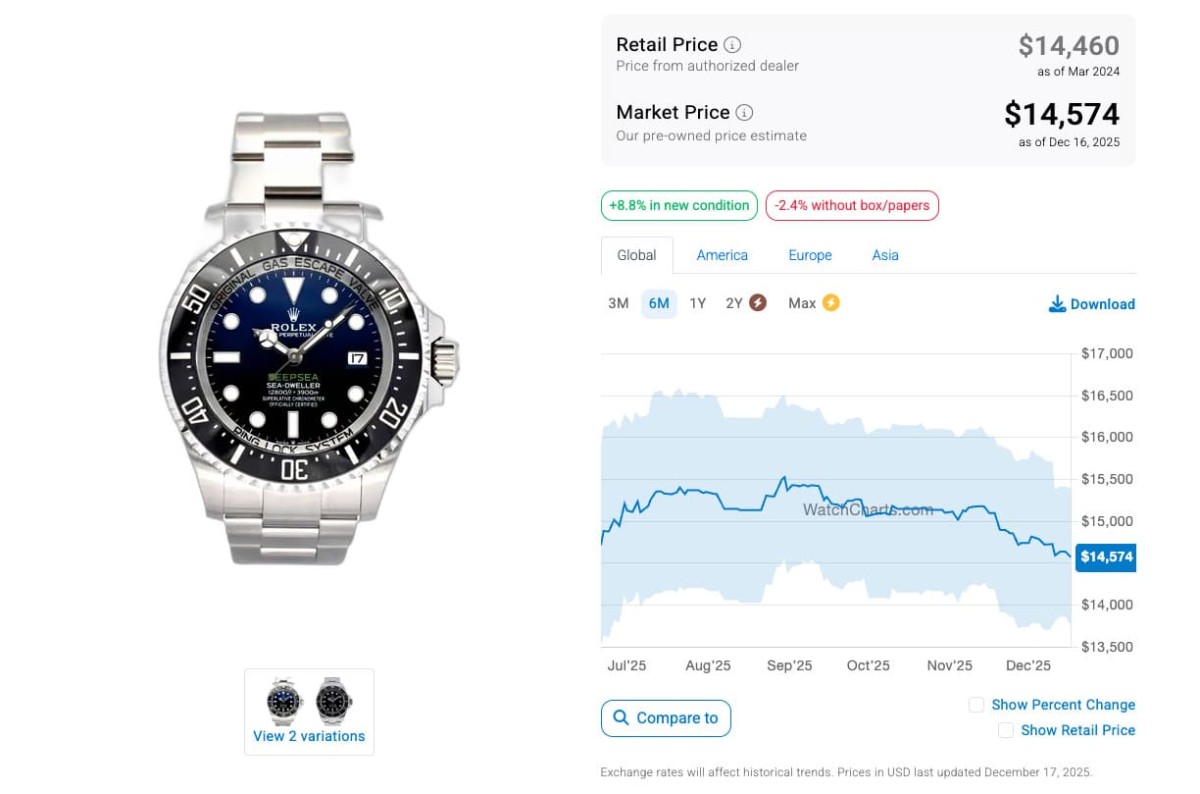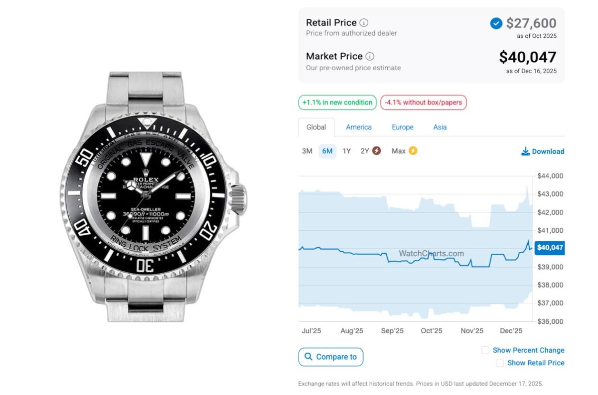 到了2025年12月,同样从WatchCharts提供的报价资讯中可见,两款Deepsea 136660近一个月来行情半斤八两,其中136660 D-Blue最新的国外报价是14,574美金(约合台币46万),而黑面136660则是12,449美金(约合台币39万2),原本两个型号约半年前明明都跌到近年新低,如今行情不是回到低点就是再创更低点。黑面136660进入到2025年跌破13,000美金关卡,但7月继4、5两个月后又再度冲破13,000美金,甚至到8月又还有一波小涨,不过到9月后开始往下走往13,000美金靠拢,到了10月之后迄今都只有12,XXX开头的水准。D-Blue在2025年3月曾令人意外地身价有点往上冲的趋势,到了4月至6月中又开始直直落,没想到从那时起到7月又有比较明显的走高曲线,8月微微降温,9月~12月持续下滑。至于Deepsea Challenge的蜜月期虽早就已经过完,它的二级市场价格从2025年4月至7月开始有微微往上扬的趋势,然后前四个月又跌下来一点,直到11月后有比较明显的反弹趋势,12月更上层楼写下半年新高,这款手表现在的报价来到40,047美金(约合台币126万2),继7月后再度回到4万美金以上,目前行情也比半年前要高,从Deepsea Challenge现在普遍的行情来看,它的受欢迎程度还是系列中最高的。