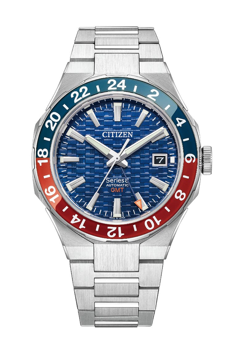 CITIZEN标榜抗磁性能的机械表Series 8系列让人第一眼就很有FU。这款新作的表壳以不锈钢制成,表径为41mm,品牌首先推出的作品有三款,分别是蓝红双色表圈配蓝色面盘、蓝黑双色表圈配黑色面盘,以及表壳和链带镀成金色、採用棕色与米色双色表圈、搭配不规则雕琢纹路的黄金面盘,是不是觉得有点熟悉?光看表圈的配色就会让人想起某知名”R”牌的百事圈、蓝黑圈与沙士圈两地时间手表。
