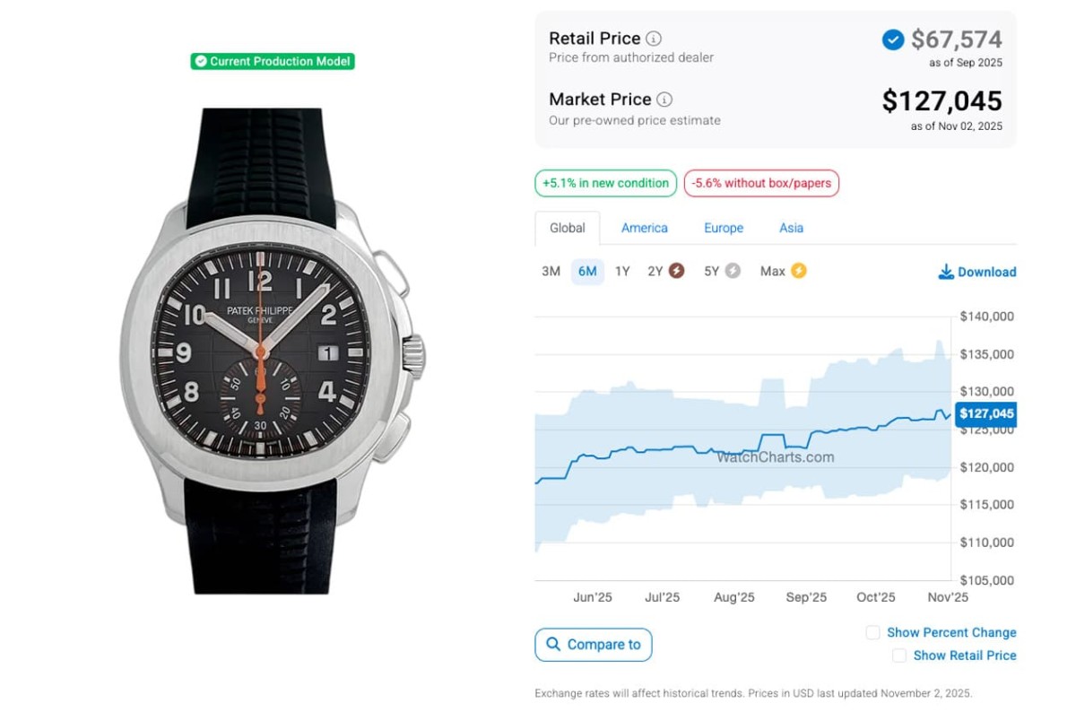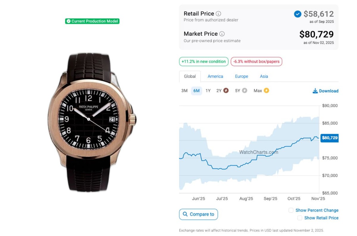 依序看下来如5167A:59,398美金(约合台币183万)、5167R:80,729美金(约合台币248万6)、5168G-001:83,001美金(约合台币255万6)、5968A:127,045美金(约合台币391万2)和5968G:109,815美金(约合台币338万)。光看这些数字还是很可观,其中仅一款的走势没有成长得那麼顺风顺水就是,那就是5968G-010这款白金计时码表,它在7、8月之际曾有比较明显的上扬,但在那之后至今,价格就没有一路走高,而是起起伏伏。至于其他四款多半在2025年4月的钟表与奇迹表展前后就开始逐渐起飞,目前也都处在半年来的身价高峰,如此突破性的进展让人再次见识到表王的光环以及旗下手表的保值效应,而这点直接由手表的超定价情况检视或许会更有感。
