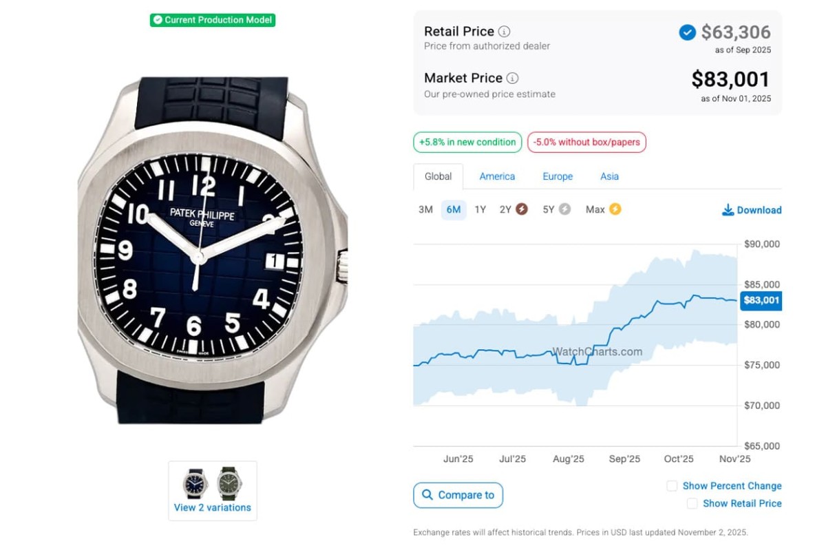 根据高级手表市场调查研究机构WatchCharts的资料,上述Aquanaut系列人气作品的二级市场行情在2025年5月左右分别是5167A:52,597美金(约合台币162万)、5167R:74,994美金(约合台币231万)、5168G-001:74,974美金(约合台币2308万)、5968A:117,908美金(约合台币363万)和5968G-010:109,394美金(约合台币336万8),每一款比起定价都高满多的,由此可知在2022年第一季尾声时手表行情曾经冲到的巔峰状态有多惊人,使它们经历三年来的价格下滑期之后,超定价情况还是显而易见。