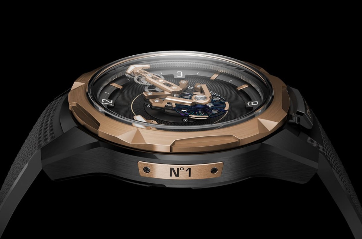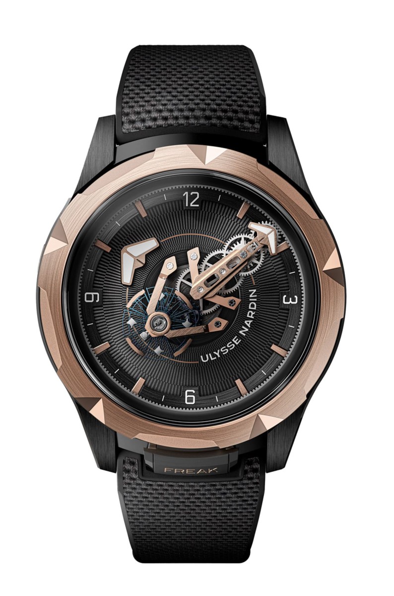 Freak One採用黑色DLC钛金属与玫瑰金亦材质组合打造直径达44mm的表壳,其玫瑰金表圈具有的坑纹装饰与早期Freak奇想腕表採用的凹槽表圈有异曲同工之感,而镀黑的钛金属锥形表耳则与较晚期出现的系列作品呼应;除此之外,在Freak One身上还能找到源自Freak Cruiser腕表的开放式齿轮设计,或是受Freak Vision腕表启发的清晰读时机芯布局等。而且系列行之多年,早已内化到腕表内部的重要设计如表圈锁定装置、DIAMonSIL钻石硅技术(在硅零件外表镀上人造钻石涂层以提升零件耐用度),以及从Freak InnoVision 2昇华成自动上链设计伴随而来的Grinder®磨床式上链系统等也都一应俱全。Grinder®磨床式上链系统特色在于将自动盘改造为搭配四枚棘爪的弹性圆形框架,并且与发条盒上链轮相连,如此一来一旦佩戴者手部产生任何动作,都可以带动自动上链系统运作,从中获得两倍的驱动力,大幅提升机芯上链效能。