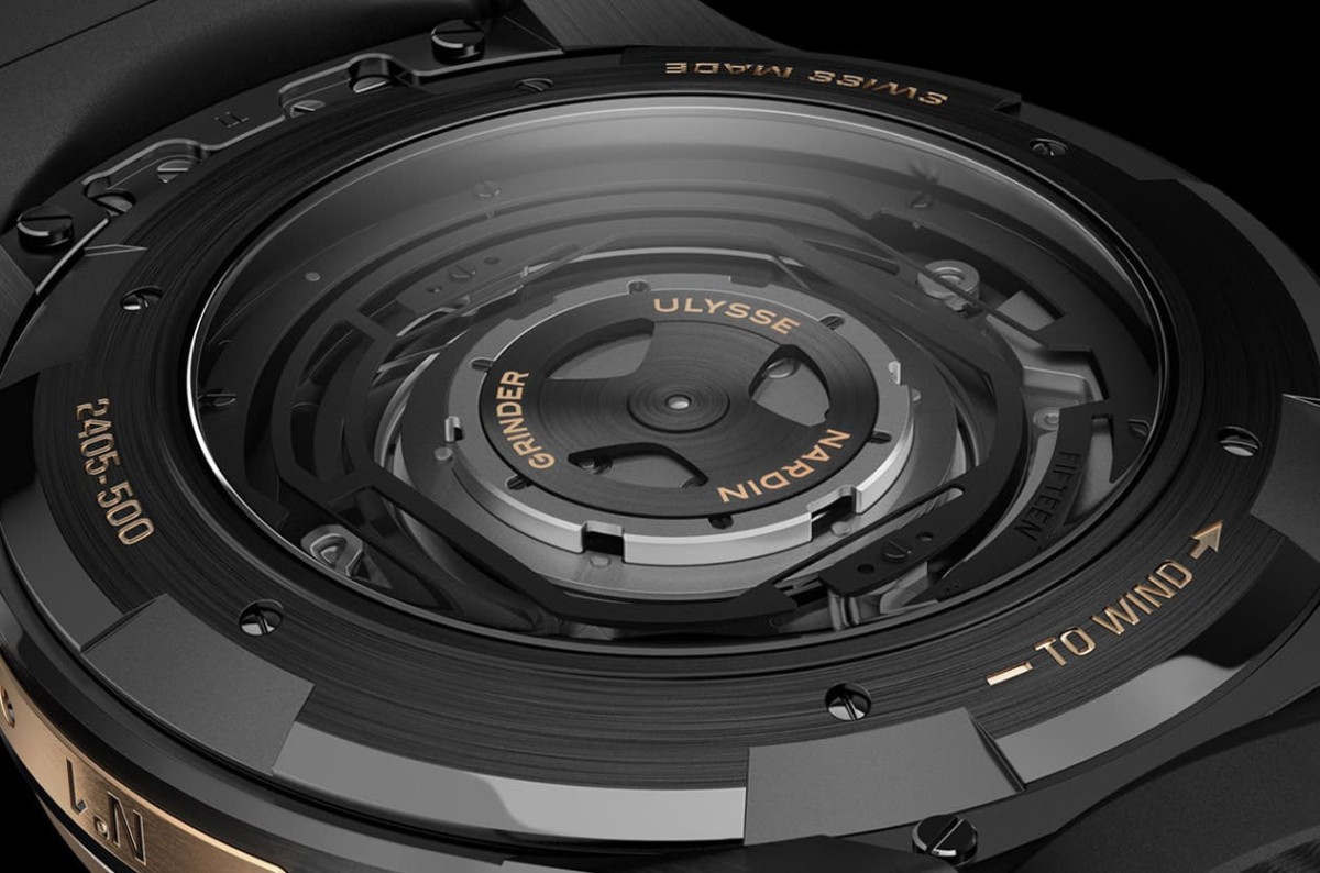 ▲透明底盖边框刻有说明文字指示佩戴者依循特定方向旋转即可替腕表上錬,同时还能清楚看到UN-240机芯蕴含的Grinder®磨床式上链系统,独特设计令人印象深刻。