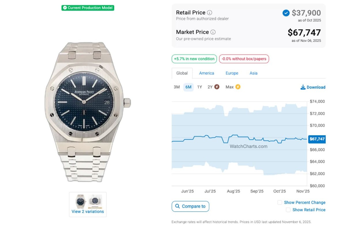 又过了半年到2025年11月,原本16202ST的行情在2025年5月中旬开始有点起色,暂时摆脱3月初的一小段低潮,到6月后又有小涨,使得手表国外二级市场的报价达到半年内的高点,不过接下来到7月又微微往下降了些,而到了8月初曾经一度冲到比6月更高的68,5XX美金,可持续到8月下旬至今又开始一路微幅跌价并保持相对稳定的发展;同样由WatchCharts的资料库中找到的国外市场报价可知,这款表目前的行情回跌至67,747美金(约合台币209万8)。回顾2023年12月中旬时这款表价格开始跌破8万5千美金关卡,从那之后至今,16202ST的行情持续往8万美金的那条线靠拢,如今跌到剩不到7字头,戏剧性的发展有点出人意料。即使如此,16202ST还是稳稳的处于超定价境界,以最新的国外报价来计算,手表的溢价率还是有78.7%%之多,一只不锈钢二针运动表能够索价200万台币,这真的是要像皇家橡树般的巨星级地位才有可能达到。