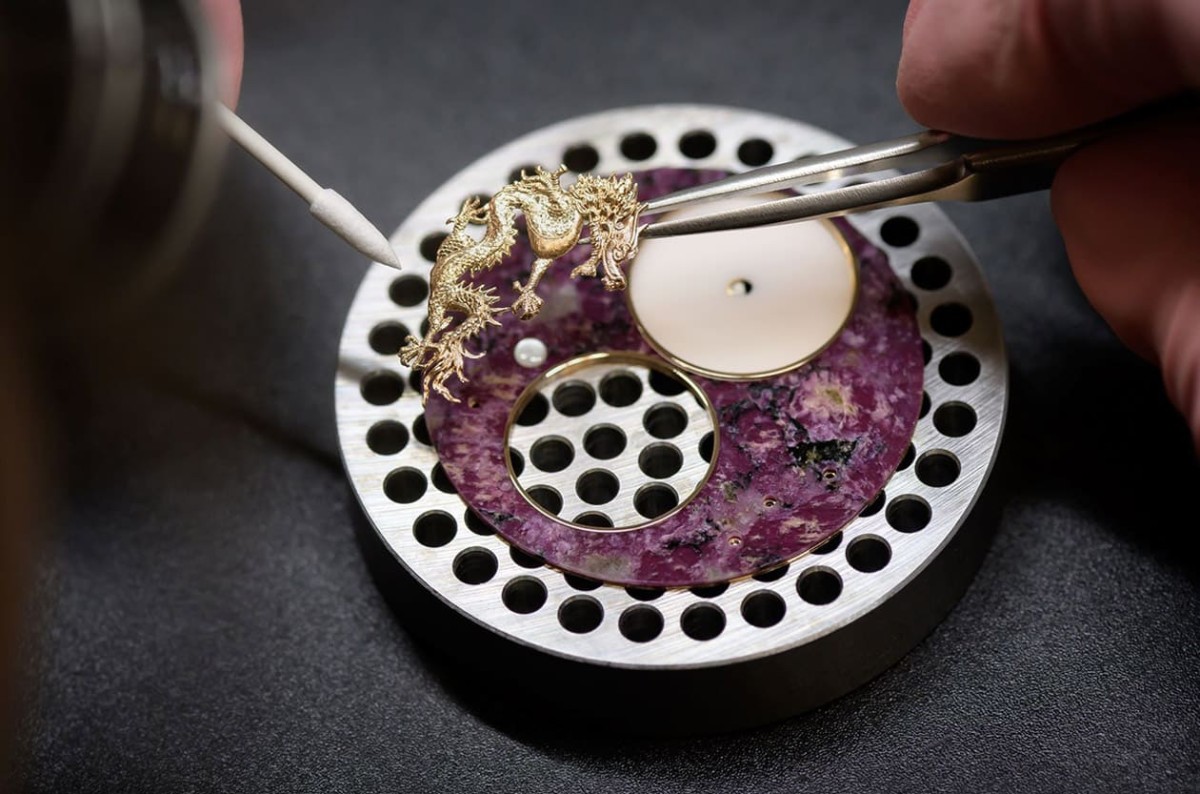 两种神兽皆以玫瑰金材质为基础,工艺师一刀刀刻出眼睛、嘴喙、鳞甲与鬃毛等细节,勾勒出一股既富有动态联想又寓意龙凤呈祥的迷人画面。表款搭载A&S8200手上链机芯,其厚度仅2.97mm,属于超薄陀飞轮设计,而且它的动力储存与前述两款作品同样都有90小时的高水准,陀飞轮框架中还巧妙做出箭头造型,因此能够延伸出显示小秒的作用,手表既能精准走时,面盘的视觉美感也不同凡响,再加上充裕的动能,各方面条件都达到尖端水准。