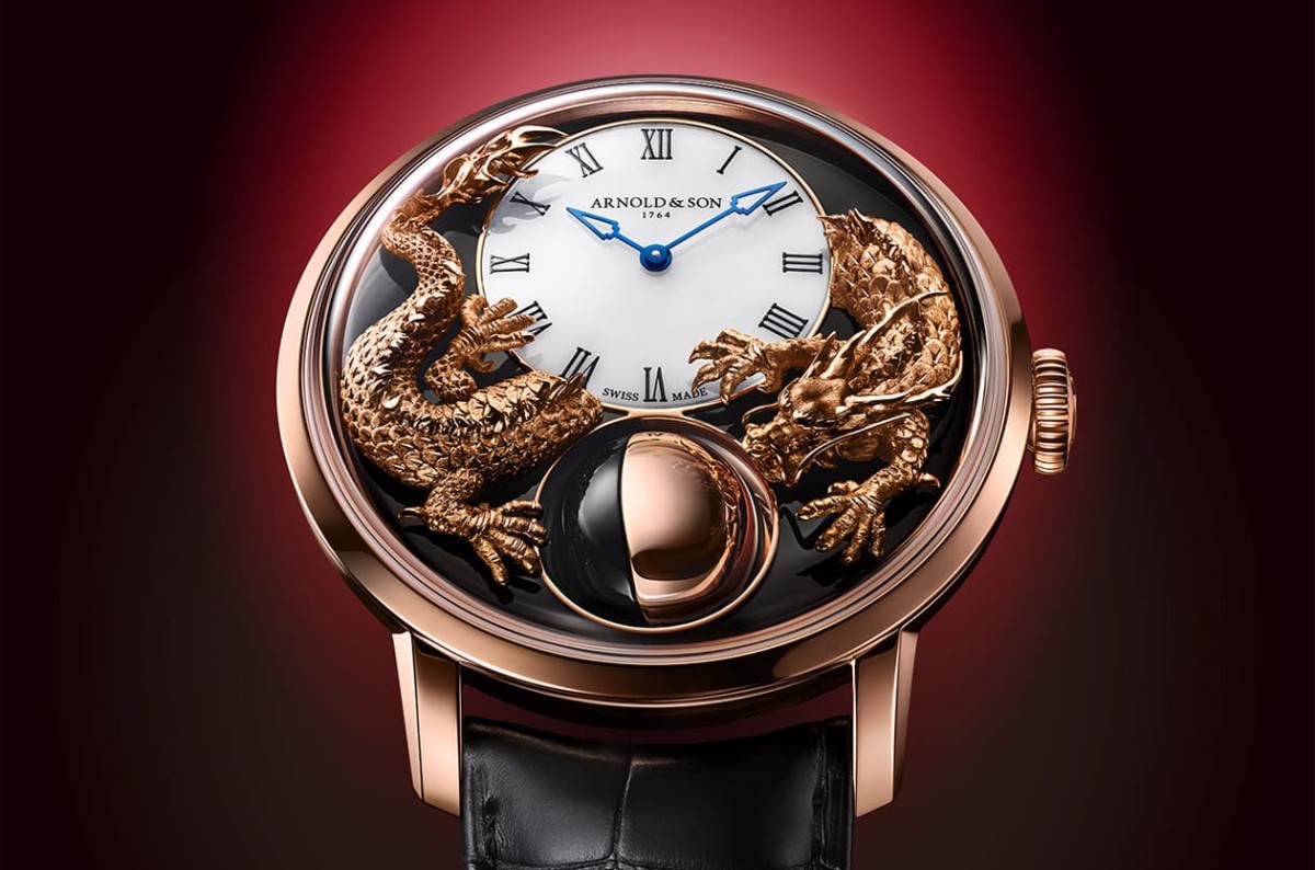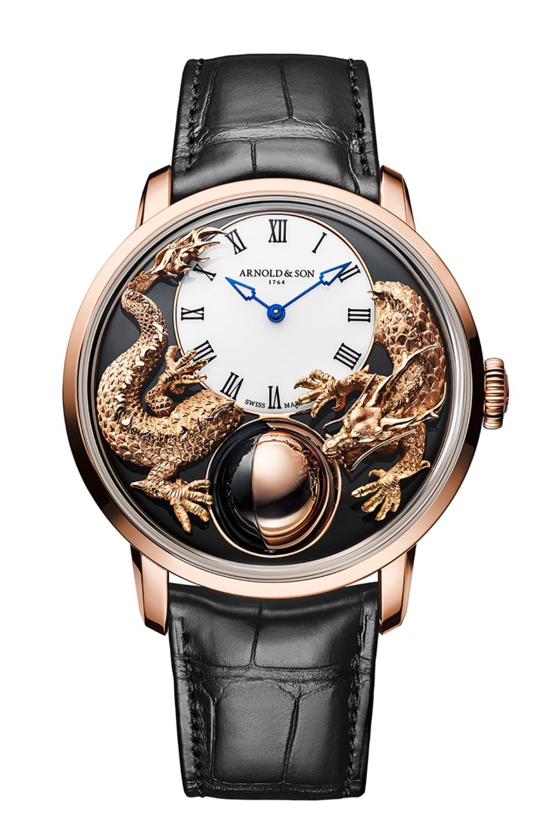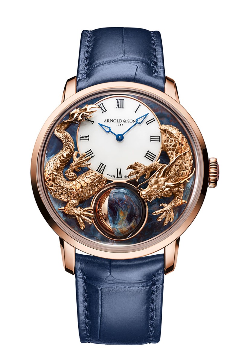 ARNOLD & SON另一款龙年生肖表为Luna Magna皓月红金龙年表,这款表同样具有月相功能,而且品牌还将月相从平面昇华至立体,以球体形式代表月相,而且这项装置同样是122年才会出现一天误差,ARNOLD & SON採用玫瑰金以及与面盘相同的矿石材质(微蓝色纹理的彼得石或亮黑色縞玛瑙)制作球体月亮,矿石部分犹如月表上的阴影,因此随着球体自转可以让玫瑰金半球体产生圆缺的效果。至于手表的主题——龙年图案也是用手工雕刻成形,品牌工艺师雕逐出立体的金龙造型,包括龙鬚、鳞片、爪子的细节都生动呈现,而且龙形金雕主要由两部分组成,刚好以白色蛋白石偏心小表盘为分界,营造出金龙身体潜伏于小表盘之下的若影若现感。