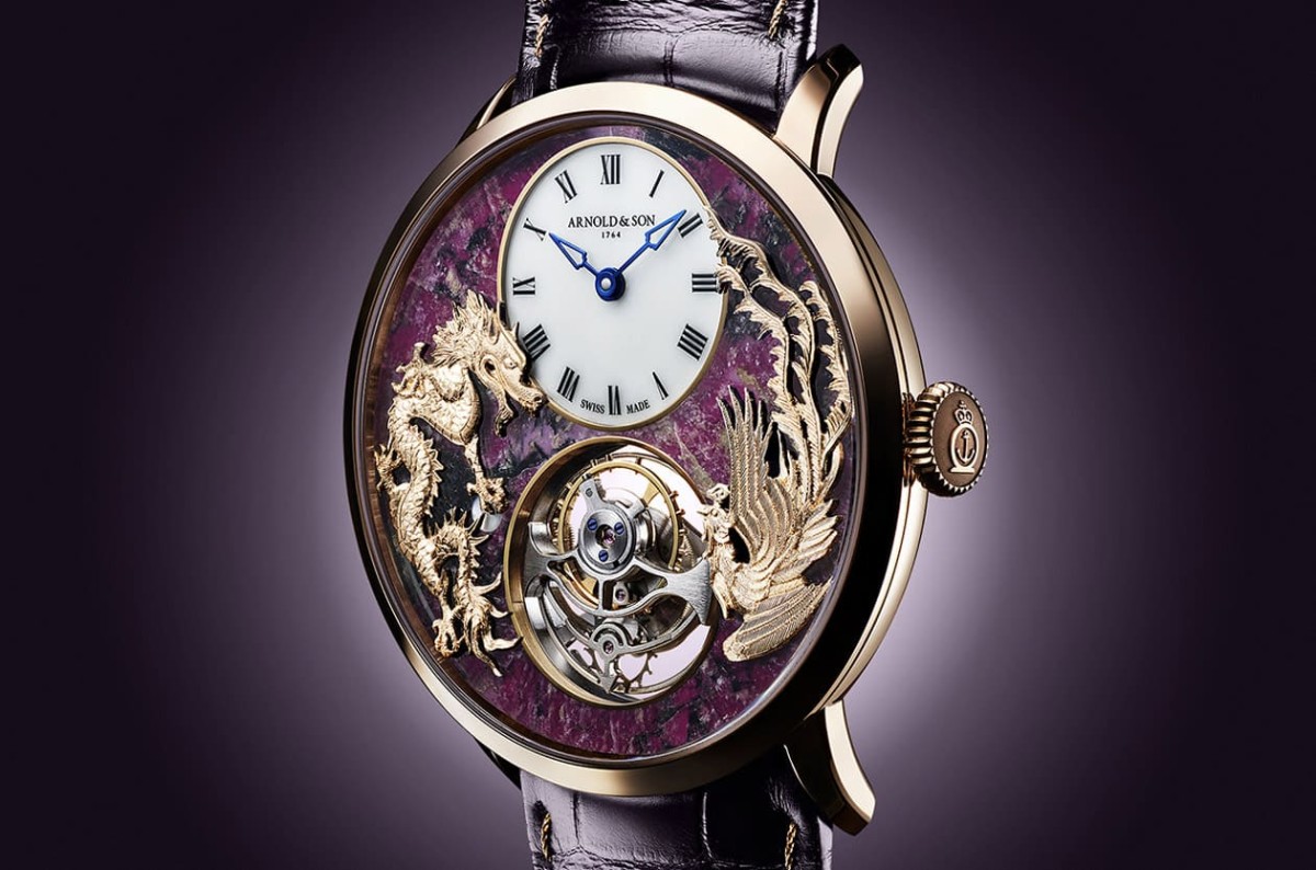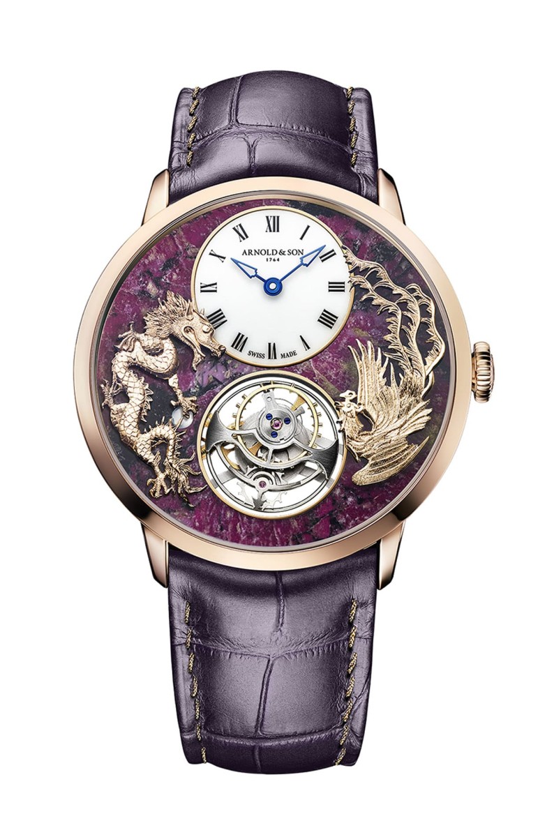 18K玫瑰金材质/A&S8200手动上链机芯/偏心时、偏心分、小秒显示/陀飞轮装置/异性石面盘镶嵌手工雕刻龙与凤图案/蓝宝石水晶镜面、透明底盖/防水30米/表径42mm/限量5只/参考价:NT$ 4,118,000