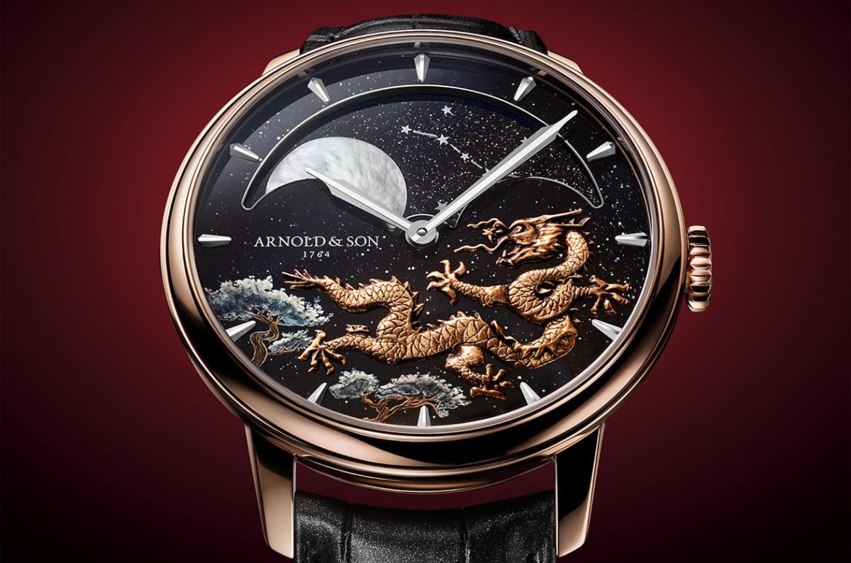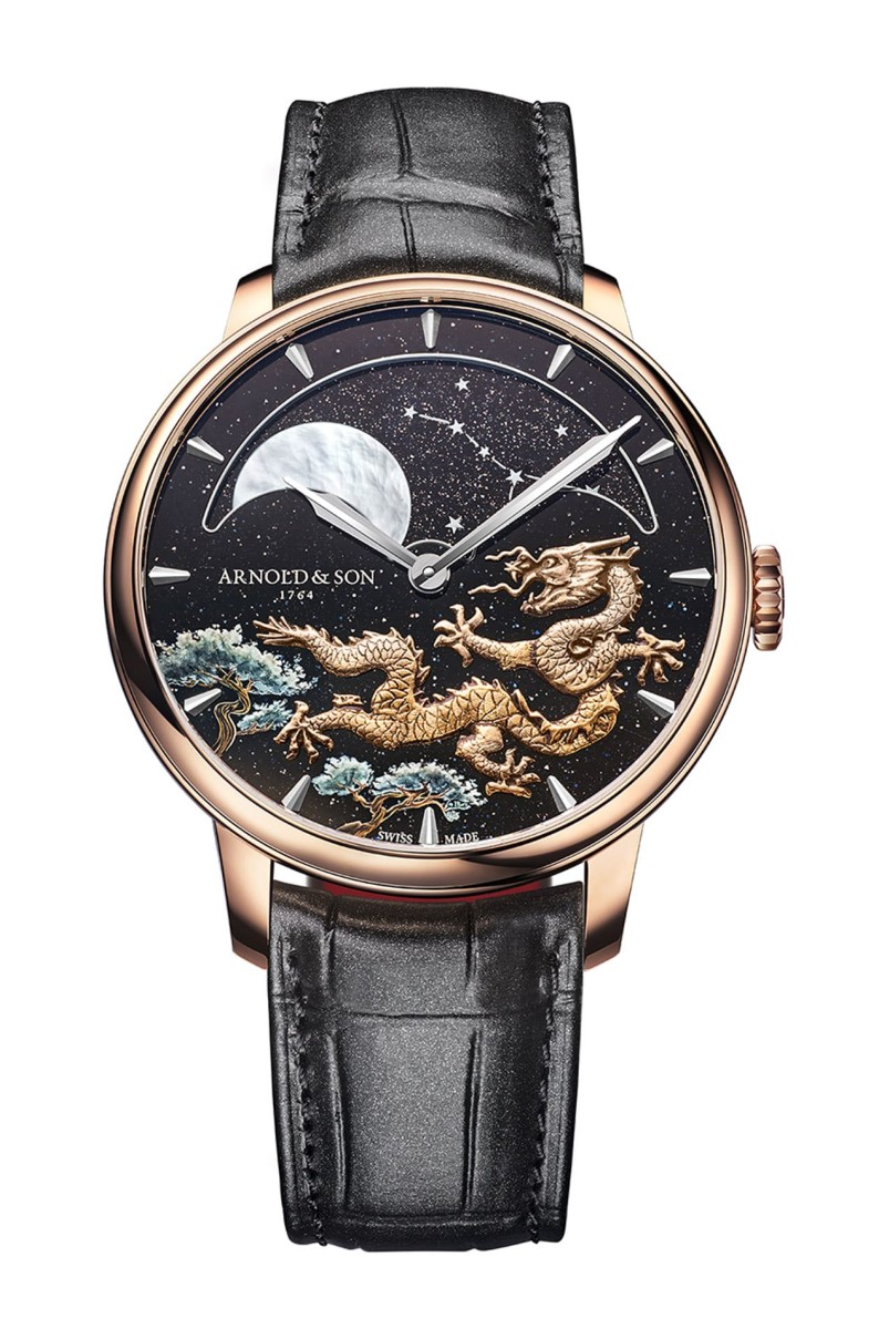 首先看到的是Perpetual Moon恆久月相龙年表,ARNOLD & SON对于龙年生肖有了全盘的了解后,以「木龙年」为设计概念,延伸出面盘上富有震撼力的画面。手表原本便拥有独树一帜的大型月相装置,品牌採用砂金石制作面盘使其营造出浓浓的星空意象,其中月相转盘也是採用砂金石材质,而月亮图案则是以珍珠母贝制成,品牌工艺师还在其表面手绘上犹如月球陨石坑的阴影,并在转盘添上大熊星、仙后座以及北极星图案,细腻设计让月相充满看头。至于面盘下半部则镶有手工雕刻的金龙图案,其呈现在空中盘踞之姿,包括龙爪以及悠扬的鬍鬚都刻画入微,因此金龙看似在夜空中神游。